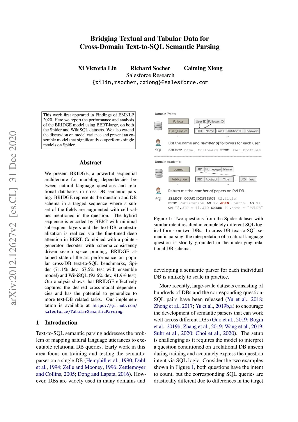 We present BRIDGE, a powerful sequential architecture for modeling dependencies between natural language questions and relational databases in cross-DB semantic parsing. BRIDGE represents the question and DB schema in a tagged sequence where a subset of the fields are augmented with cell values mentioned in the question. The hybrid sequence is encoded by BERT with minimal subsequent layers and the text-DB contextualization is realized via the fine-tuned deep attention in BERT. Combined with a pointer-generator decoder with schema-consistency driven search space pruning, BRIDGE attained state-of-the-art performance on popular cross-DB text-to-SQL benchmarks, Spider (71.1\% dev, 67.5\% test with ensemble model) and WikiSQL (92.6\% dev, 91.9\% test). Our analysis shows that BRIDGE effectively captures the desired cross-modal dependencies and has the potential to generalize to more text-DB related tasks. Our implementation is available at \url{https://github.com/salesforce/TabularSemanticParsing}.