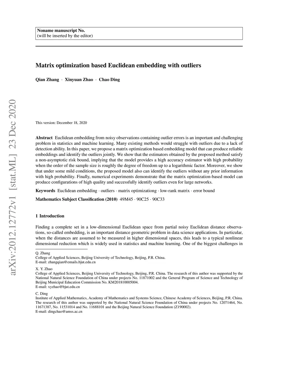 Euclidean embedding from noisy observations containing outlier errors is an important and challenging problem in statistics and machine learning. Many existing methods would struggle with outliers due to a lack of detection ability. In this paper, we propose a matrix optimization based embedding model that can produce reliable embeddings and identify the outliers jointly. We show that the estimators obtained by the proposed method satisfy a non-asymptotic risk bound, implying that the model provides a high accuracy estimator with high probability when the order of the sample size is roughly the degree of freedom up to a logarithmic factor. Moreover, we show that under some mild conditions, the proposed model also can identify the outliers without any prior information with high probability. Finally, numerical experiments demonstrate that the matrix optimization-based model can produce configurations of high quality and successfully identify outliers even for large networks.