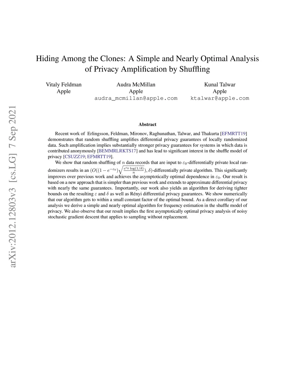 Recent work of Erlingsson, Feldman, Mironov, Raghunathan, Talwar, and Thakurta [EFMRTT19] demonstrates that random shuffling amplifies differential privacy guarantees of locally randomized data. Such amplification implies substantially stronger privacy guarantees for systems in which data is contributed anonymously [BEMMRLRKTS17] and has lead to significant interest in the shuffle model of privacy [CSUZZ19; EFMRTT19]. We show that random shuffling of data records that are input to -differentially private local randomizers results in an -differentially private algorithm. This significantly improves over previous work and achieves the asymptotically optimal dependence in . Our result is based on a new approach that is simpler than previous work and extends to approximate differential privacy with nearly the same guarantees. Importantly, our work also yields an algorithm for deriving tighter bounds on the resulting and as well as R\ényi differential privacy guarantees. We show numerically that our algorithm gets to within a small constant factor of the optimal bound. As a direct corollary of our analysis we derive a simple and nearly optimal algorithm for frequency estimation in the shuffle model of privacy. We also observe that our result implies the first asymptotically optimal privacy analysis of noisy stochastic gradient descent that applies to sampling without replacement.