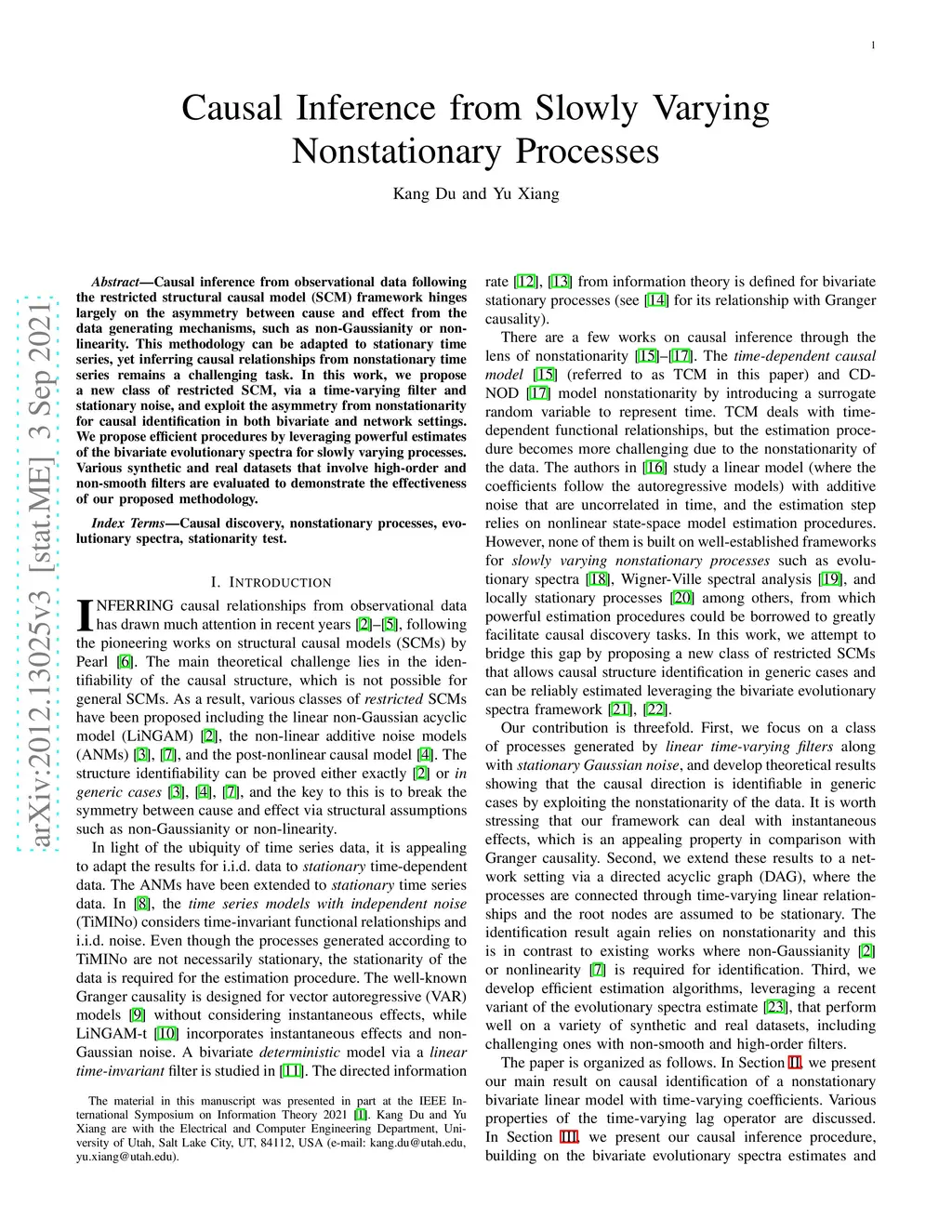 Causal inference from observational data following the restricted structural causal model (SCM) framework hinges largely on the asymmetry between cause and effect from the data generating mechanisms, such as non-Gaussianity or nonlinearity. This methodology can be adapted to stationary time series, yet inferring causal relationships from nonstationary time series remains a challenging task. In this work, we propose a new class of restricted SCM, via a time-varying filter and stationary noise, and exploit the asymmetry from nonstationarity for causal identification in both bivariate and network settings. We propose efficient procedures by leveraging powerful estimates of the bivariate evolutionary spectra for slowly varying processes. Various synthetic and real datasets that involve high-order and non-smooth filters are evaluated to demonstrate the effectiveness of our proposed methodology.