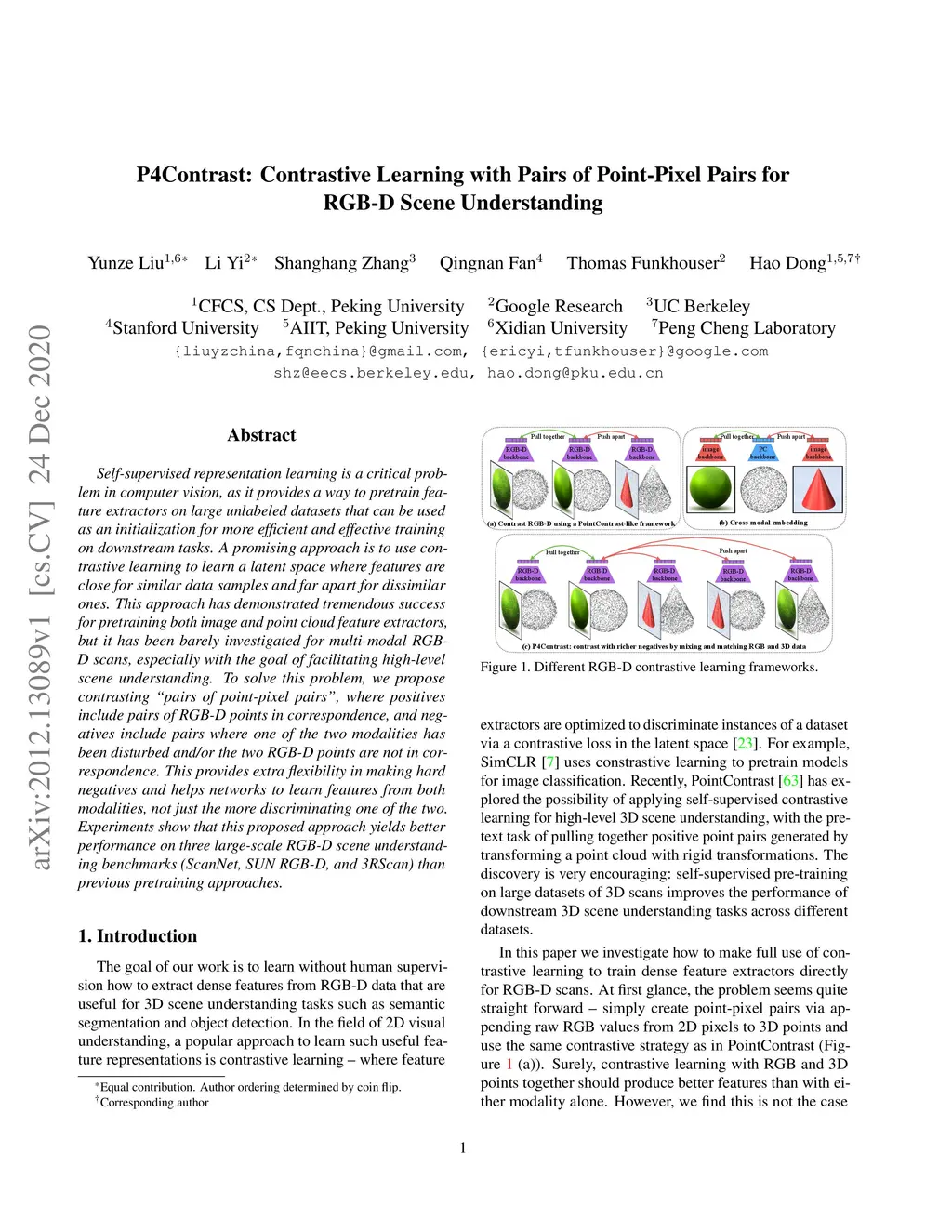 Self-supervised representation learning is a critical problem in computer vision, as it provides a way to pretrain feature extractors on large unlabeled datasets that can be used as an initialization for more efficient and effective training on downstream tasks. A promising approach is to use contrastive learning to learn a latent space where features are close for similar data samples and far apart for dissimilar ones. This approach has demonstrated tremendous success for pretraining both image and point cloud feature extractors, but it has been barely investigated for multi-modal RGB-D scans, especially with the goal of facilitating high-level scene understanding. To solve this problem, we propose contrasting "pairs of point-pixel pairs", where positives include pairs of RGB-D points in correspondence, and negatives include pairs where one of the two modalities has been disturbed and/or the two RGB-D points are not in correspondence. This provides extra flexibility in making hard negatives and helps networks to learn features from both modalities, not just the more discriminating one of the two. Experiments show that this proposed approach yields better performance on three large-scale RGB-D scene understanding benchmarks (ScanNet, SUN RGB-D, and 3RScan) than previous pretraining approaches.