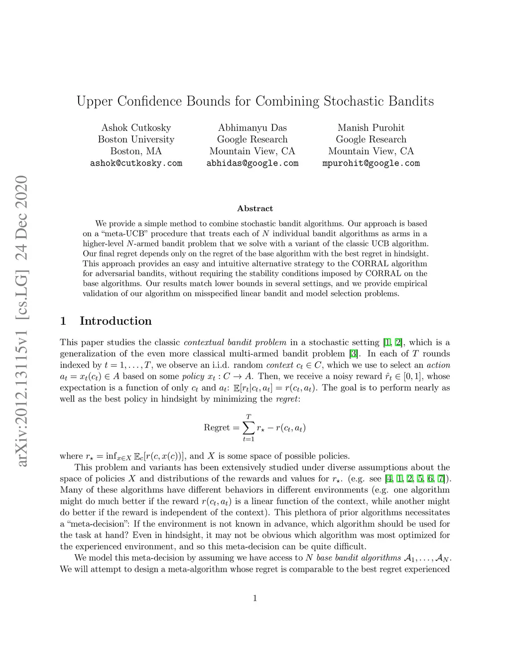 We provide a simple method to combine stochastic bandit algorithms. Our approach is based on a "meta-UCB" procedure that treats each of individual bandit algorithms as arms in a higher-level -armed bandit problem that we solve with a variant of the classic UCB algorithm. Our final regret depends only on the regret of the base algorithm with the best regret in hindsight. This approach provides an easy and intuitive alternative strategy to the CORRAL algorithm for adversarial bandits, without requiring the stability conditions imposed by CORRAL on the base algorithms. Our results match lower bounds in several settings, and we provide empirical validation of our algorithm on misspecified linear bandit and model selection problems.
