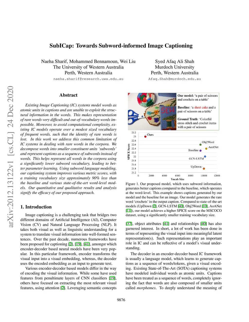Existing Image Captioning (IC) systems model words as atomic units in captions and are unable to exploit the structural information in the words. This makes representation of rare words very difficult and out-of-vocabulary words impossible. Moreover, to avoid computational complexity, existing IC models operate over a modest sized vocabulary of frequent words, such that the identity of rare words is lost. In this work we address this common limitation of IC systems in dealing with rare words in the corpora. We decompose words into smaller constituent units 'subwords' and represent captions as a sequence of subwords instead of words. This helps represent all words in the corpora using a significantly lower subword vocabulary, leading to better parameter learning. Using subword language modeling, our captioning system improves various metric scores, with a training vocabulary size approximately 90% less than the baseline and various state-of-the-art word-level models. Our quantitative and qualitative results and analysis signify the efficacy of our proposed approach.