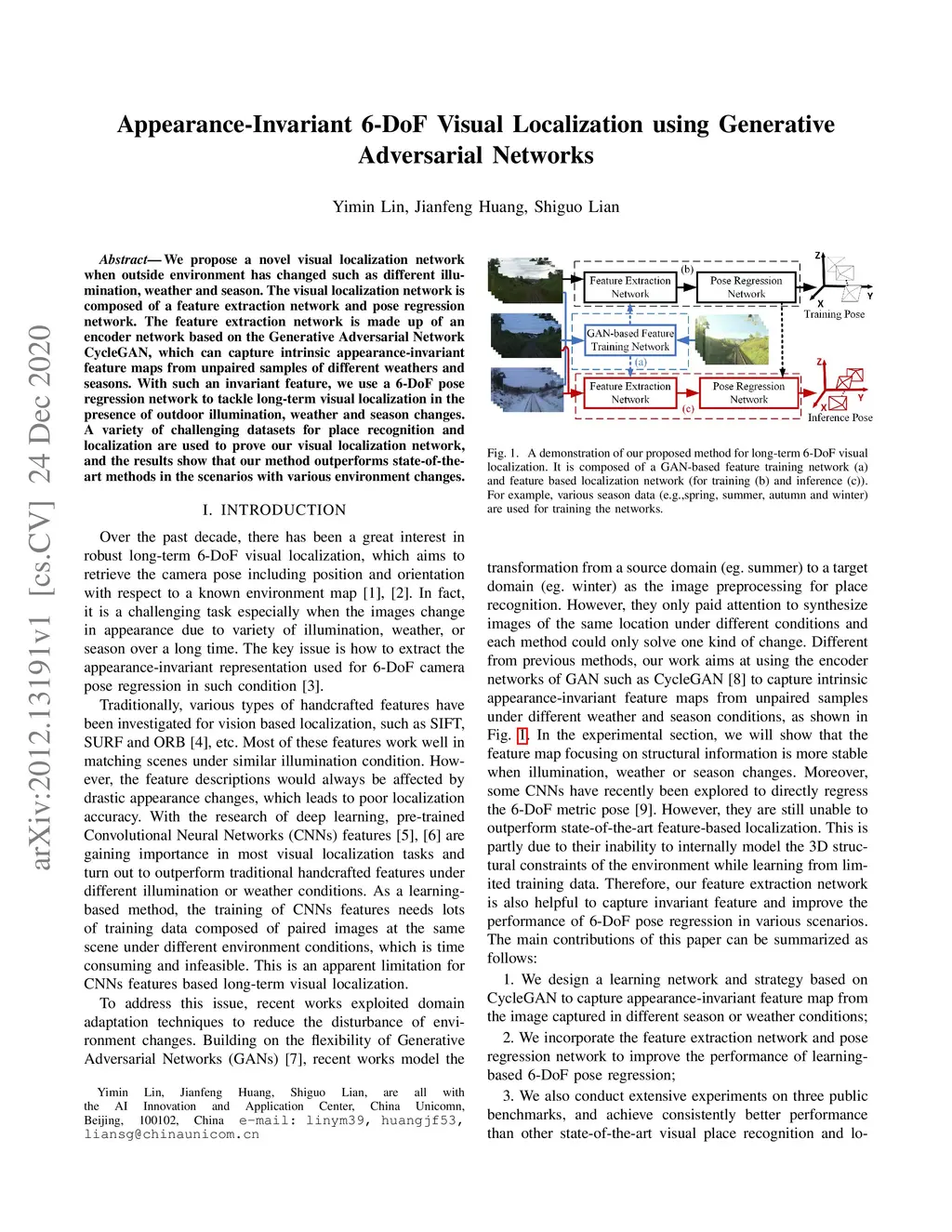 We propose a novel visual localization network when outside environment has changed such as different illumination, weather and season. The visual localization network is composed of a feature extraction network and pose regression network. The feature extraction network is made up of an encoder network based on the Generative Adversarial Network CycleGAN, which can capture intrinsic appearance-invariant feature maps from unpaired samples of different weathers and seasons. With such an invariant feature, we use a 6-DoF pose regression network to tackle long-term visual localization in the presence of outdoor illumination, weather and season changes. A variety of challenging datasets for place recognition and localization are used to prove our visual localization network, and the results show that our method outperforms state-of-the-art methods in the scenarios with various environment changes.