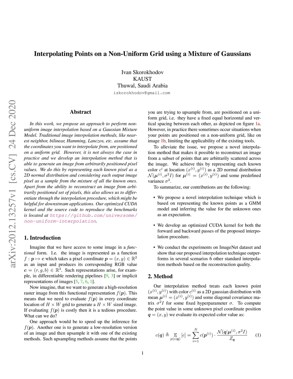 In this work, we propose an approach to perform non-uniform image interpolation based on a Gaussian Mixture Model. Traditional image interpolation methods, like nearest neighbor, bilinear, Hamming, Lanczos, etc. assume that the coordinates you want to interpolate from, are positioned on a uniform grid. However, it is not always the case in practice and we develop an interpolation method that is able to generate an image from arbitrarily positioned pixel values. We do this by representing each known pixel as a 2D normal distribution and considering each output image pixel as a sample from the mixture of all the known ones. Apart from the ability to reconstruct an image from arbitrarily positioned set of pixels, this also allows us to differentiate through the interpolation procedure, which might be helpful for downstream applications. Our optimized CUDA kernel and the source code to reproduce the benchmarks is located at https://github.com/universome/non-uniform-interpolation.