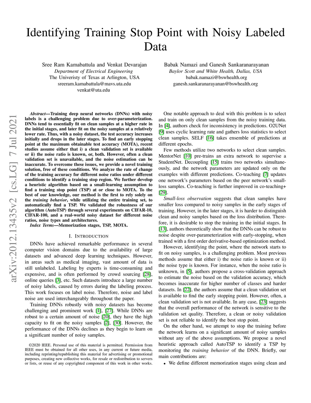 Training deep neural networks (DNNs) with noisy labels is a challenging problem due to over-parameterization. DNNs tend to essentially fit on clean samples at a higher rate in the initial stages, and later fit on the noisy samples at a relatively lower rate. Thus, with a noisy dataset, the test accuracy increases initially and drops in the later stages. To find an early stopping point at the maximum obtainable test accuracy (MOTA), recent studies assume either that i) a clean validation set is available or ii) the noise ratio is known, or, both. However, often a clean validation set is unavailable, and the noise estimation can be inaccurate. To overcome these issues, we provide a novel training solution, free of these conditions. We analyze the rate of change of the training accuracy for different noise ratios under different conditions to identify a training stop region. We further develop a heuristic algorithm based on a small-learning assumption to find a training stop point (TSP) at or close to MOTA. To the best of our knowledge, our method is the first to rely solely on the \textit{training behavior}, while utilizing the entire training set, to automatically find a TSP. We validated the robustness of our algorithm (AutoTSP) through several experiments on CIFAR-10, CIFAR-100, and a real-world noisy dataset for different noise ratios, noise types, and architectures.