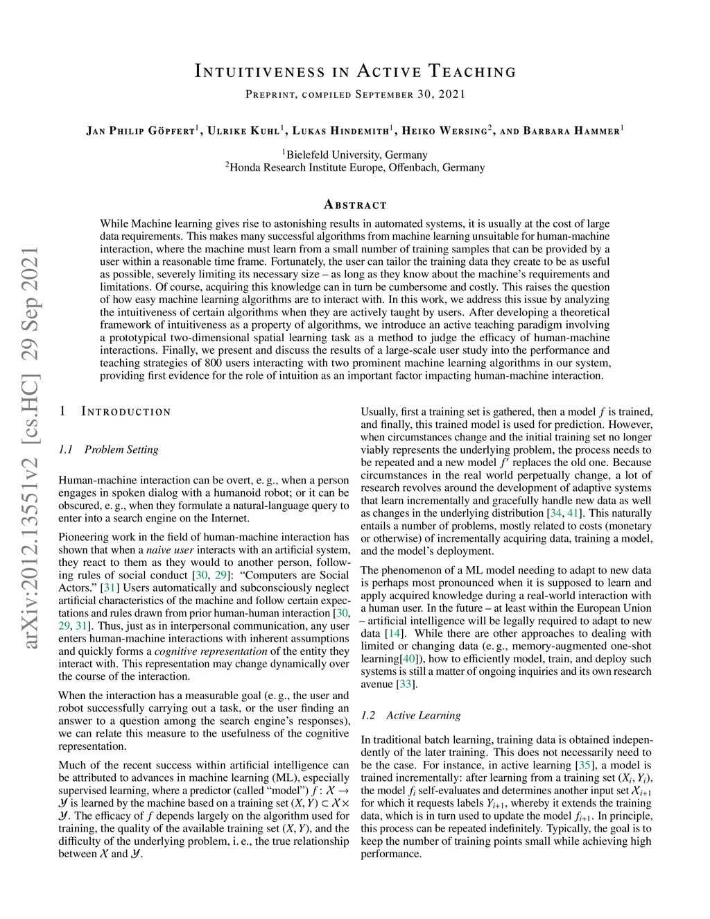 While Machine learning gives rise to astonishing results in automated systems, it is usually at the cost of large data requirements. This makes many successful algorithms from machine learning unsuitable for human-machine interaction, where the machine must learn from a small number of training samples that can be provided by a user within a reasonable time frame. Fortunately, the user can tailor the training data they create to be as useful as possible, severely limiting its necessary size -- as long as they know about the machine's requirements and limitations. Of course, acquiring this knowledge can in turn be cumbersome and costly. This raises the question of how easy machine learning algorithms are to interact with. In this work, we address this issue by analyzing the intuitiveness of certain algorithms when they are actively taught by users. After developing a theoretical framework of intuitiveness as a property of algorithms, we introduce an active teaching paradigm involving a prototypical two-dimensional spatial learning task as a method to judge the efficacy of human-machine interactions. Finally, we present and discuss the results of a large-scale user study into the performance and teaching strategies of 800 users interacting with two prominent machine learning algorithms in our system, providing first evidence for the role of intuition as an important factor impacting human-machine interaction.