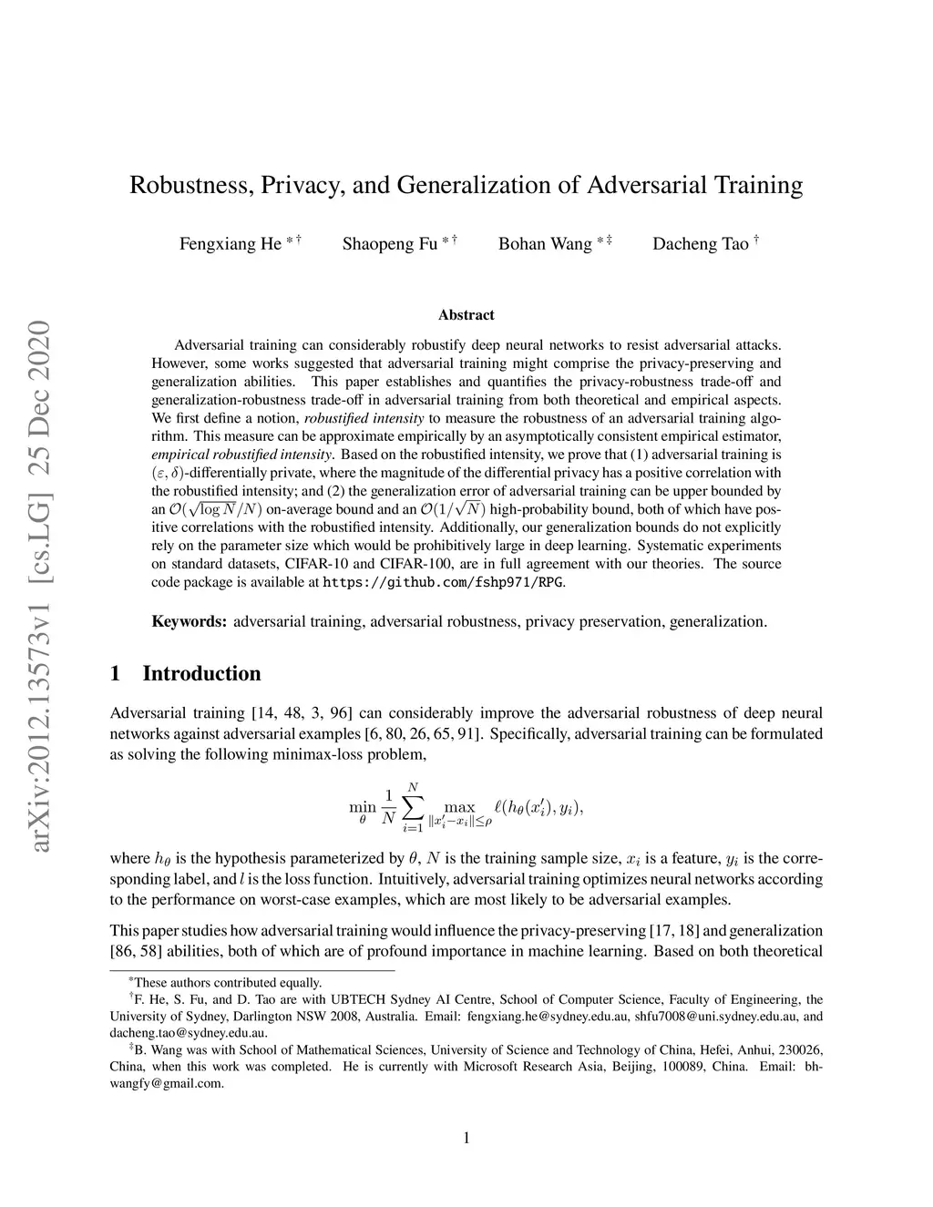Adversarial training can considerably robustify deep neural networks to resist adversarial attacks. However, some works suggested that adversarial training might comprise the privacy-preserving and generalization abilities. This paper establishes and quantifies the privacy-robustness trade-off and generalization-robustness trade-off in adversarial training from both theoretical and empirical aspects. We first define a notion, {\it robustified intensity} to measure the robustness of an adversarial training algorithm. This measure can be approximate empirically by an asymptotically consistent empirical estimator, {\it empirical robustified intensity}. Based on the robustified intensity, we prove that (1) adversarial training is -differentially private, where the magnitude of the differential privacy has a positive correlation with the robustified intensity; and (2) the generalization error of adversarial training can be upper bounded by an on-average bound and an high-probability bound, both of which have positive correlations with the robustified intensity. Additionally, our generalization bounds do not explicitly rely on the parameter size which would be prohibitively large in deep learning. Systematic experiments on standard datasets, CIFAR-10 and CIFAR-100, are in full agreement with our theories. The source code package is available at \url{https://github.com/fshp971/RPG}.