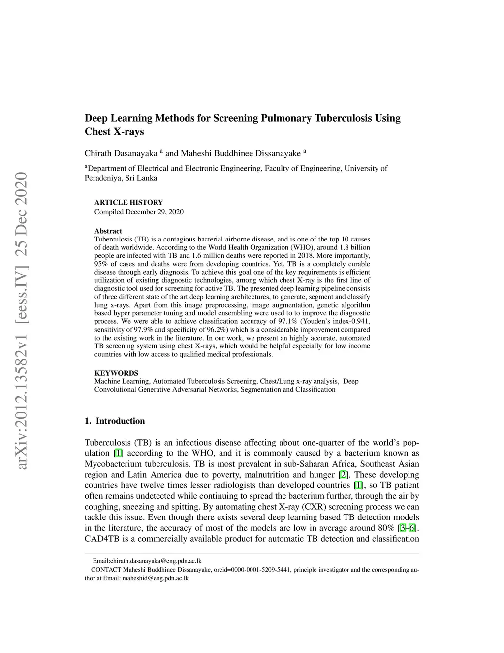 Tuberculosis (TB) is a contagious bacterial airborne disease, and is one of the top 10 causes of death worldwide. According to the World Health Organization (WHO), around 1.8 billion people are infected with TB and 1.6 million deaths were reported in 2018. More importantly,95% of cases and deaths were from developing countries. Yet, TB is a completely curable disease through early diagnosis. To achieve this goal one of the key requirements is efficient utilization of existing diagnostic technologies, among which chest X-ray is the first line of diagnostic tool used for screening for active TB. The presented deep learning pipeline consists of three different state of the art deep learning architectures, to generate, segment and classify lung X-rays. Apart from this image preprocessing, image augmentation, genetic algorithm based hyper parameter tuning and model ensembling were used to to improve the diagnostic process. We were able to achieve classification accuracy of 97.1% (Youden's index-0.941,sensitivity of 97.9% and specificity of 96.2%) which is a considerable improvement compared to the existing work in the literature. In our work, we present an highly accurate, automated TB screening system using chest X-rays, which would be helpful especially for low income countries with low access to qualified medical professionals.
