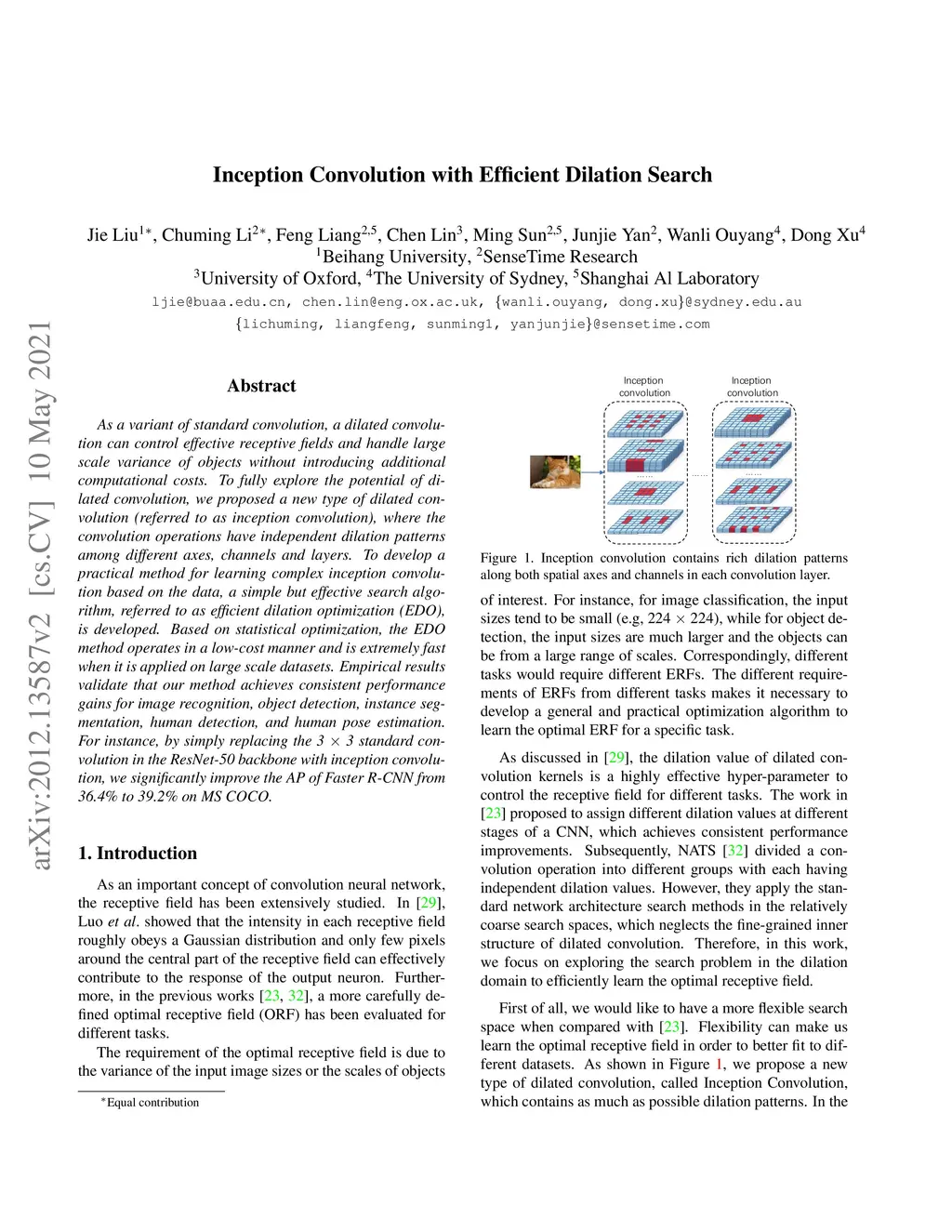 As a variant of standard convolution, a dilated convolution can control effective receptive fields and handle large scale variance of objects without introducing additional computational costs. To fully explore the potential of dilated convolution, we proposed a new type of dilated convolution (referred to as inception convolution), where the convolution operations have independent dilation patterns among different axes, channels and layers. To develop a practical method for learning complex inception convolution based on the data, a simple but effective search algorithm, referred to as efficient dilation optimization (EDO), is developed. Based on statistical optimization, the EDO method operates in a low-cost manner and is extremely fast when it is applied on large scale datasets. Empirical results validate that our method achieves consistent performance gains for image recognition, object detection, instance segmentation, human detection, and human pose estimation. For instance, by simply replacing the 3x3 standard convolution in the ResNet-50 backbone with inception convolution, we significantly improve the AP of Faster R-CNN from 36.4% to 39.2% on MS COCO.