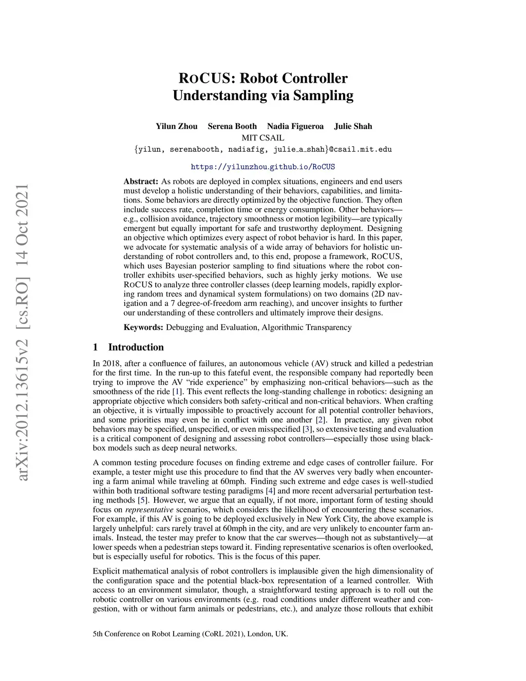 As robots are deployed in complex situations, engineers and end users must develop a holistic understanding of their behaviors, capabilities, and limitations. Some behaviors are directly optimized by the objective function. They often include success rate, completion time or energy consumption. Other behaviors -- e.g., collision avoidance, trajectory smoothness or motion legibility -- are typically emergent but equally important for safe and trustworthy deployment. Designing an objective which optimizes every aspect of robot behavior is hard. In this paper, we advocate for systematic analysis of a wide array of behaviors for holistic understanding of robot controllers and, to this end, propose a framework, RoCUS, which uses Bayesian posterior sampling to find situations where the robot controller exhibits user-specified behaviors, such as highly jerky motions. We use RoCUS to analyze three controller classes (deep learning models, rapidly exploring random trees and dynamical system formulations) on two domains (2D navigation and a 7 degree-of-freedom arm reaching), and uncover insights to further our understanding of these controllers and ultimately improve their designs.