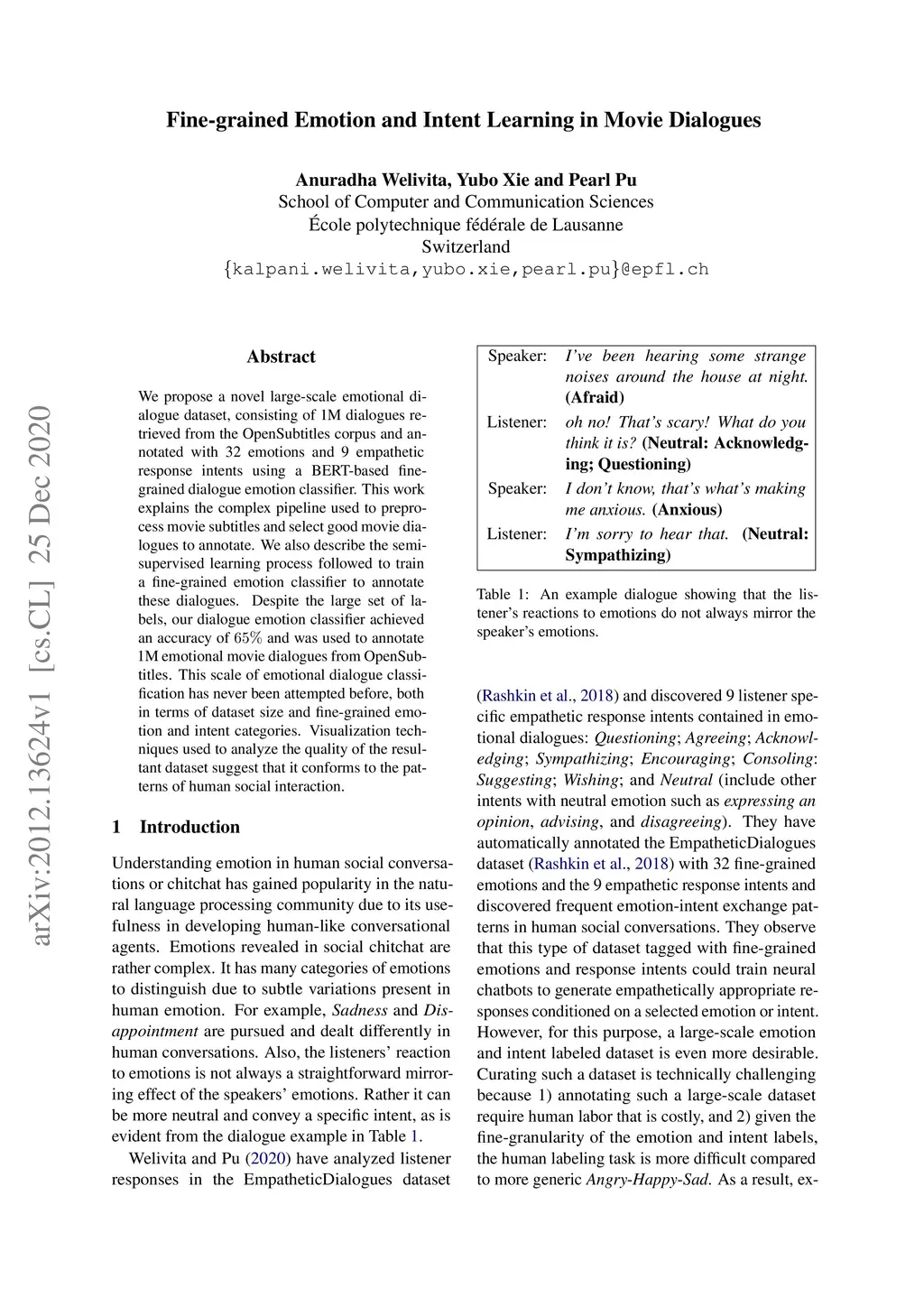 Fine-grained Emotion and Intent Learning in Movie Dialogues