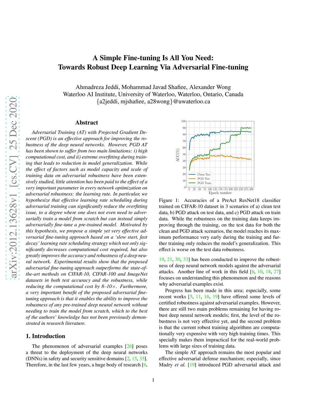 Adversarial Training (AT) with Projected Gradient Descent (PGD) is an effective approach for improving the robustness of the deep neural networks. However, PGD AT has been shown to suffer from two main limitations: i) high computational cost, and ii) extreme overfitting during training that leads to reduction in model generalization. While the effect of factors such as model capacity and scale of training data on adversarial robustness have been extensively studied, little attention has been paid to the effect of a very important parameter in every network optimization on adversarial robustness: the learning rate. In particular, we hypothesize that effective learning rate scheduling during adversarial training can significantly reduce the overfitting issue, to a degree where one does not even need to adversarially train a model from scratch but can instead simply adversarially fine-tune a pre-trained model. Motivated by this hypothesis, we propose a simple yet very effective adversarial fine-tuning approach based on a learning rate scheduling strategy which not only significantly decreases computational cost required, but also greatly improves the accuracy and robustness of a deep neural network. Experimental results show that the proposed adversarial fine-tuning approach outperforms the state-of-the-art methods on CIFAR-10, CIFAR-100 and ImageNet datasets in both test accuracy and the robustness, while reducing the computational cost by 8-10. Furthermore, a very important benefit of the proposed adversarial fine-tuning approach is that it enables the ability to improve the robustness of any pre-trained deep neural network without needing to train the model from scratch, which to the best of the authors' knowledge has not been previously demonstrated in research literature.