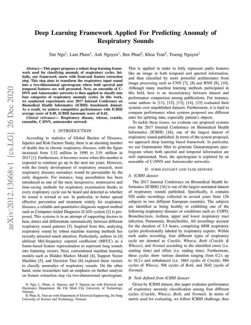 This paper proposes a robust deep learning framework used for classifying anomaly of respiratory cycles. Initially, our framework starts with front-end feature extraction step. This step aims to transform the respiratory input sound into a two-dimensional spectrogram where both spectral and temporal features are well presented. Next, an ensemble of C- DNN and Autoencoder networks is then applied to classify into four categories of respiratory anomaly cycles. In this work, we conducted experiments over 2017 Internal Conference on Biomedical Health Informatics (ICBHI) benchmark dataset. As a result, we achieve competitive performances with ICBHI average score of 0.49, ICBHI harmonic score of 0.42.