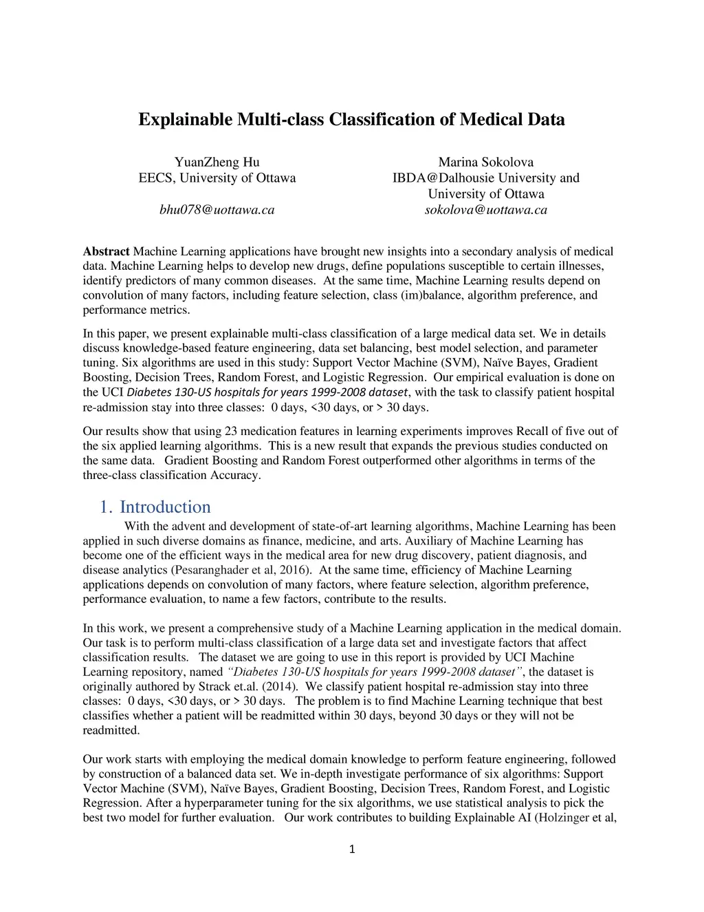 Machine Learning applications have brought new insights into a secondary analysis of medical data. Machine Learning helps to develop new drugs, define populations susceptible to certain illnesses, identify predictors of many common diseases. At the same time, Machine Learning results depend on convolution of many factors, including feature selection, class (im)balance, algorithm preference, and performance metrics. In this paper, we present explainable multi-class classification of a large medical data set. We in details discuss knowledge-based feature engineering, data set balancing, best model selection, and parameter tuning. Six algorithms are used in this study: Support Vector Machine (SVM), Na\"ive Bayes, Gradient Boosting, Decision Trees, Random Forest, and Logistic Regression. Our empirical evaluation is done on the UCI Diabetes 130-US hospitals for years 1999-2008 dataset, with the task to classify patient hospital re-admission stay into three classes: 0 days, <30 days, or > 30 days. Our results show that using 23 medication features in learning experiments improves Recall of five out of the six applied learning algorithms. This is a new result that expands the previous studies conducted on the same data. Gradient Boosting and Random Forest outperformed other algorithms in terms of the three-class classification Accuracy.