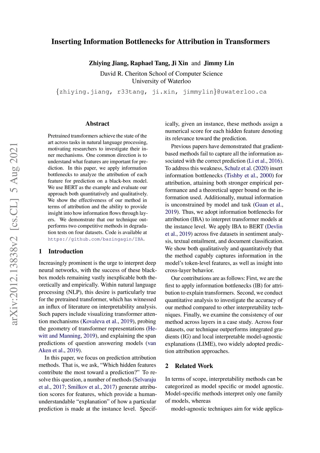 Pretrained transformers achieve the state of the art across tasks in natural language processing, motivating researchers to investigate their inner mechanisms. One common direction is to understand what features are important for prediction. In this paper, we apply information bottlenecks to analyze the attribution of each feature for prediction on a black-box model. We use BERT as the example and evaluate our approach both quantitatively and qualitatively. We show the effectiveness of our method in terms of attribution and the ability to provide insight into how information flows through layers. We demonstrate that our technique outperforms two competitive methods in degradation tests on four datasets. Code is available at https://github.com/bazingagin/IBA.