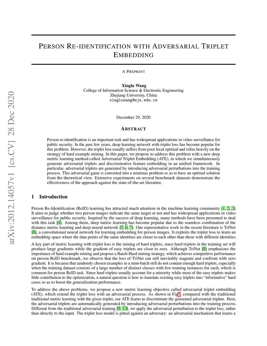 Person re-identification is an important task and has widespread applications in video surveillance for public security. In the past few years, deep learning network with triplet loss has become popular for this problem. However, the triplet loss usually suffers from poor local optimal and relies heavily on the strategy of hard example mining. In this paper, we propose to address this problem with a new deep metric learning method called Adversarial Triplet Embedding (ATE), in which we simultaneously generate adversarial triplets and discriminative feature embedding in an unified framework. In particular, adversarial triplets are generated by introducing adversarial perturbations into the training process. This adversarial game is converted into a minimax problem so as to have an optimal solution from the theoretical view. Extensive experiments on several benchmark datasets demonstrate the effectiveness of the approach against the state-of-the-art literature.