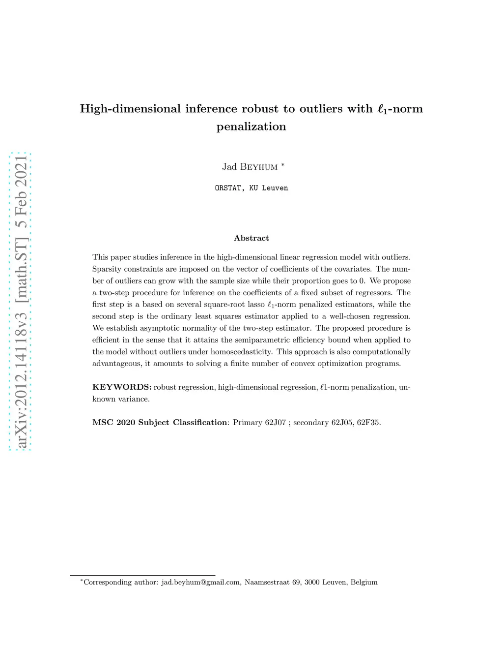 This paper studies inference in the high-dimensional linear regression model with outliers. Sparsity constraints are imposed on the vector of coefficients of the covariates. The number of outliers can grow with the sample size while their proportion goes to 0. We propose a two-step procedure for inference on the coefficients of a fixed subset of regressors. The first step is a based on several square-root lasso l1-norm penalized estimators, while the second step is the ordinary least squares estimator applied to a well chosen regression. We establish asymptotic normality of the two-step estimator. The proposed procedure is efficient in the sense that it attains the semiparametric efficiency bound when applied to the model without outliers under homoscedasticity. This approach is also computationally advantageous, it amounts to solving a finite number of convex optimization programs.