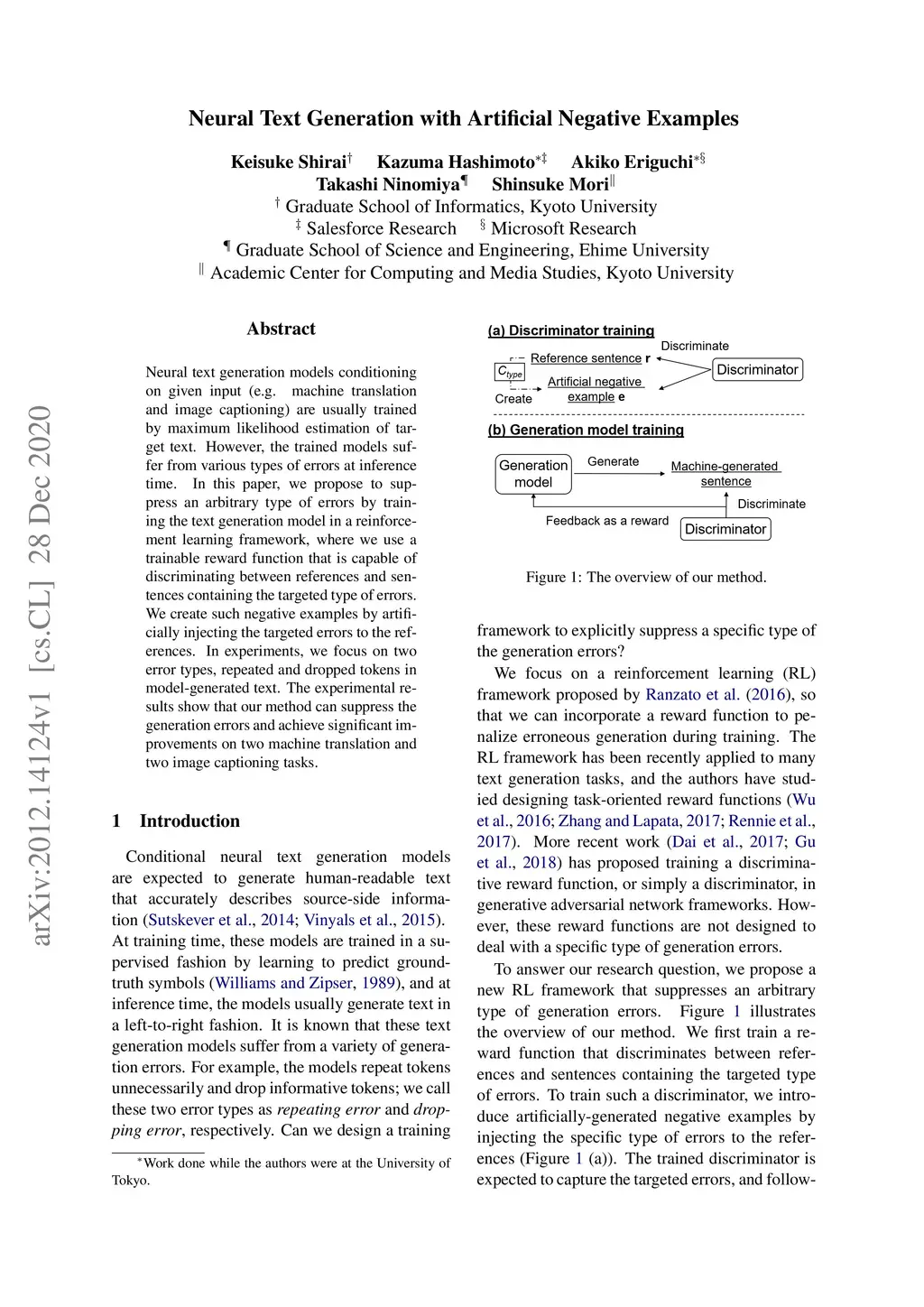 Neural text generation models conditioning on given input (e.g. machine translation and image captioning) are usually trained by maximum likelihood estimation of target text. However, the trained models suffer from various types of errors at inference time. In this paper, we propose to suppress an arbitrary type of errors by training the text generation model in a reinforcement learning framework, where we use a trainable reward function that is capable of discriminating between references and sentences containing the targeted type of errors. We create such negative examples by artificially injecting the targeted errors to the references. In experiments, we focus on two error types, repeated and dropped tokens in model-generated text. The experimental results show that our method can suppress the generation errors and achieve significant improvements on two machine translation and two image captioning tasks.