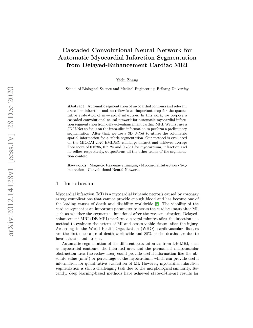 Automatic segmentation of myocardial contours and relevant areas like infraction and no-reflow is an important step for the quantitative evaluation of myocardial infarction. In this work, we propose a cascaded convolutional neural network for automatic myocardial infarction segmentation from delayed-enhancement cardiac MRI. We first use a 2D U-Net to focus on the intra-slice information to perform a preliminary segmentation. After that, we use a 3D U-Net to utilize the volumetric spatial information for a subtle segmentation. Our method is evaluated on the MICCAI 2020 EMIDEC challenge dataset and achieves average Dice score of 0.8786, 0.7124 and 0.7851 for myocardium, infarction and no-reflow respectively, outperforms all the other teams of the segmentation contest.