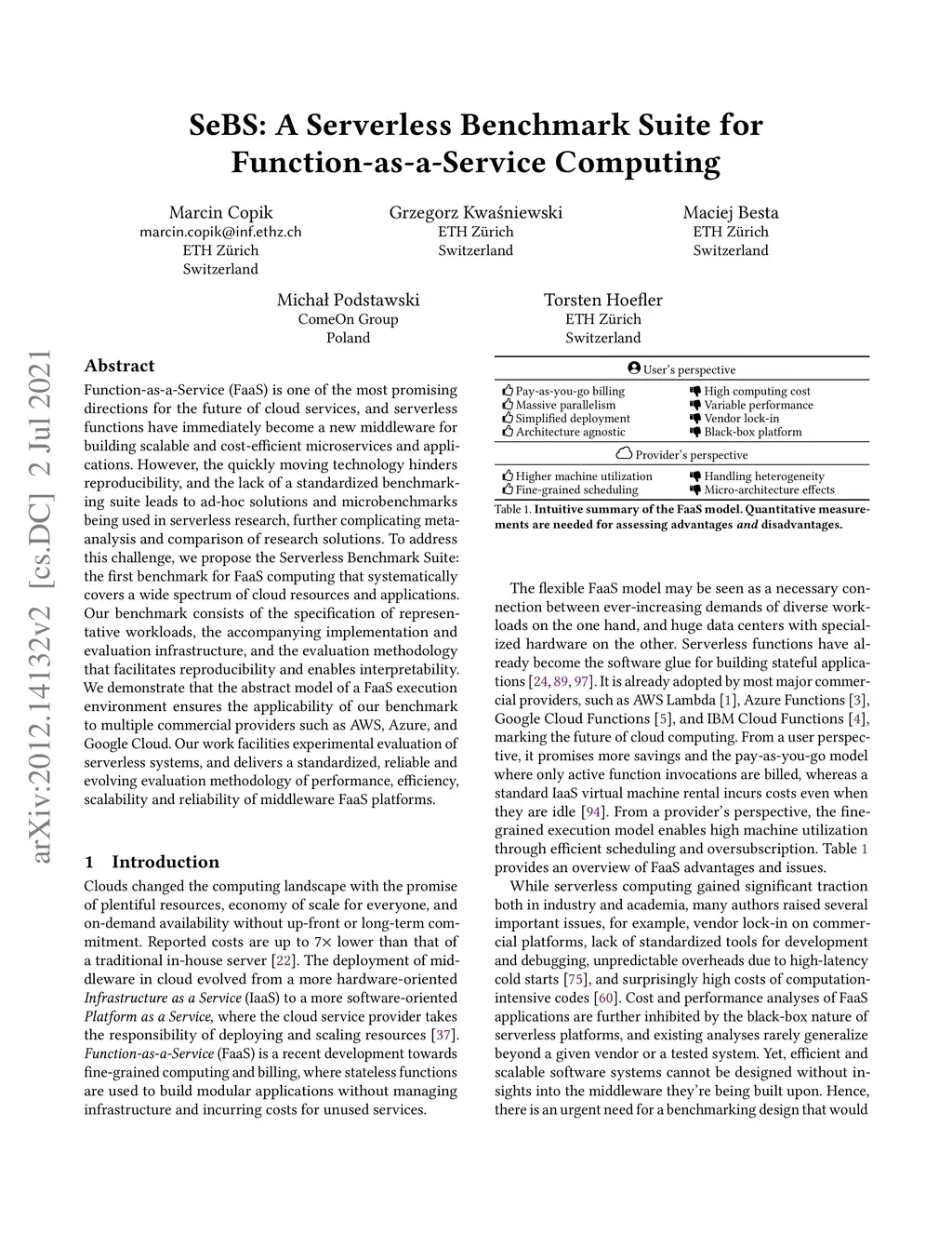 SeBS: A Serverless Benchmark Suite for Function-as-a-Service Computing