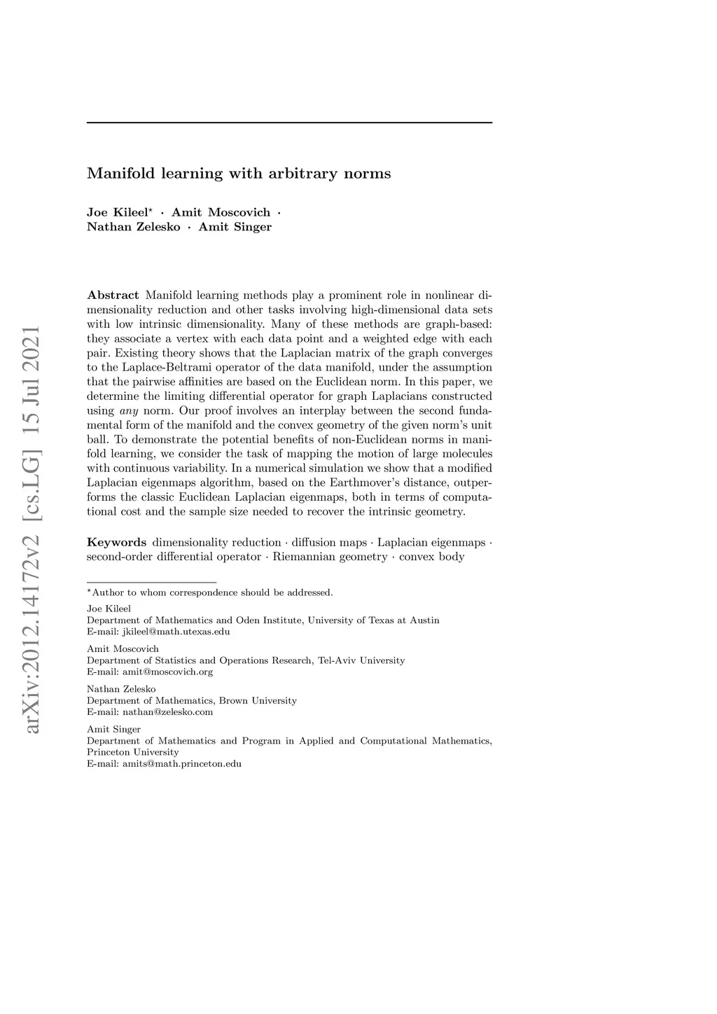 Manifold learning methods play a prominent role in nonlinear dimensionality reduction and other tasks involving high-dimensional data sets with low intrinsic dimensionality. Many of these methods are graph-based: they associate a vertex with each data point and a weighted edge with each pair. Existing theory shows that the Laplacian matrix of the graph converges to the Laplace-Beltrami operator of the data manifold, under the assumption that the pairwise affinities are based on the Euclidean norm. In this paper, we determine the limiting differential operator for graph Laplacians constructed using norm. Our proof involves an interplay between the second fundamental form of the manifold and the convex geometry of the given norm's unit ball. To demonstrate the potential benefits of non-Euclidean norms in manifold learning, we consider the task of mapping the motion of large molecules with continuous variability. In a numerical simulation we show that a modified Laplacian eigenmaps algorithm, based on the Earthmover's distance, outperforms the classic Euclidean Laplacian eigenmaps, both in terms of computational cost and the sample size needed to recover the intrinsic geometry.