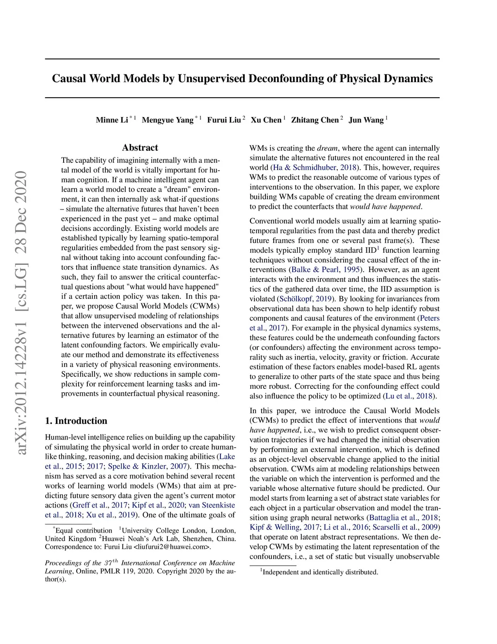 The capability of imagining internally with a mental model of the world is vitally important for human cognition. If a machine intelligent agent can learn a world model to create a "dream" environment, it can then internally ask what-if questions -- simulate the alternative futures that haven't been experienced in the past yet -- and make optimal decisions accordingly. Existing world models are established typically by learning spatio-temporal regularities embedded from the past sensory signal without taking into account confounding factors that influence state transition dynamics. As such, they fail to answer the critical counterfactual questions about "what would have happened" if a certain action policy was taken. In this paper, we propose Causal World Models (CWMs) that allow unsupervised modeling of relationships between the intervened observations and the alternative futures by learning an estimator of the latent confounding factors. We empirically evaluate our method and demonstrate its effectiveness in a variety of physical reasoning environments. Specifically, we show reductions in sample complexity for reinforcement learning tasks and improvements in counterfactual physical reasoning.
