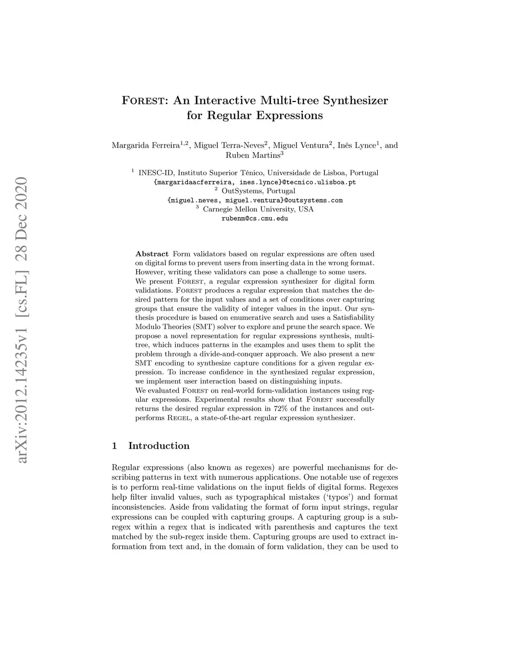 Form validators based on regular expressions are often used on digital forms to prevent users from inserting data in the wrong format. However, writing these validators can pose a challenge to some users. We present FOREST, a regular expression synthesizer for digital form validations. FOREST produces a regular expression that matches the desired pattern for the input values and a set of conditions over capturing groups that ensure the validity of integer values in the input. Our synthesis procedure is based on enumerative search and uses a Satisfiability Modulo Theories (SMT) solver to explore and prune the search space. We propose a novel representation for regular expressions synthesis, multi-tree, which induces patterns in the examples and uses them to split the problem through a divide-and-conquer approach. We also present a new SMT encoding to synthesize capture conditions for a given regular expression. To increase confidence in the synthesized regular expression, we implement user interaction based on distinguishing inputs. We evaluated FOREST on real-world form-validation instances using regular expressions. Experimental results show that FOREST successfully returns the desired regular expression in 72% of the instances and outperforms REGEL, a state-of-the-art regular expression synthesizer.