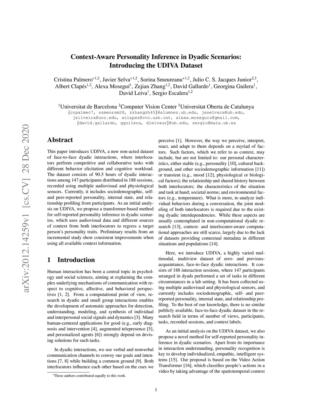 This paper introduces UDIVA, a new non-acted dataset of face-to-face dyadic interactions, where interlocutors perform competitive and collaborative tasks with different behavior elicitation and cognitive workload. The dataset consists of 90.5 hours of dyadic interactions among 147 participants distributed in 188 sessions, recorded using multiple audiovisual and physiological sensors. Currently, it includes sociodemographic, self- and peer-reported personality, internal state, and relationship profiling from participants. As an initial analysis on UDIVA, we propose a transformer-based method for self-reported personality inference in dyadic scenarios, which uses audiovisual data and different sources of context from both interlocutors to regress a target person's personality traits. Preliminary results from an incremental study show consistent improvements when using all available context information.