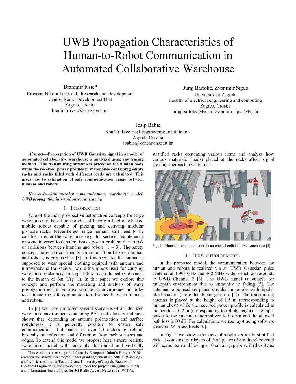 Propagation of UWB Gaussian signal in a model of automated collaborative warehouse is analyzed using ray tracing method. The transmitting antenna is placed on the human body while the received power profiles in warehouse containing empty racks and racks filled with different loads are calculated. This gives rise to estimation of safe communication range between humans and robots.