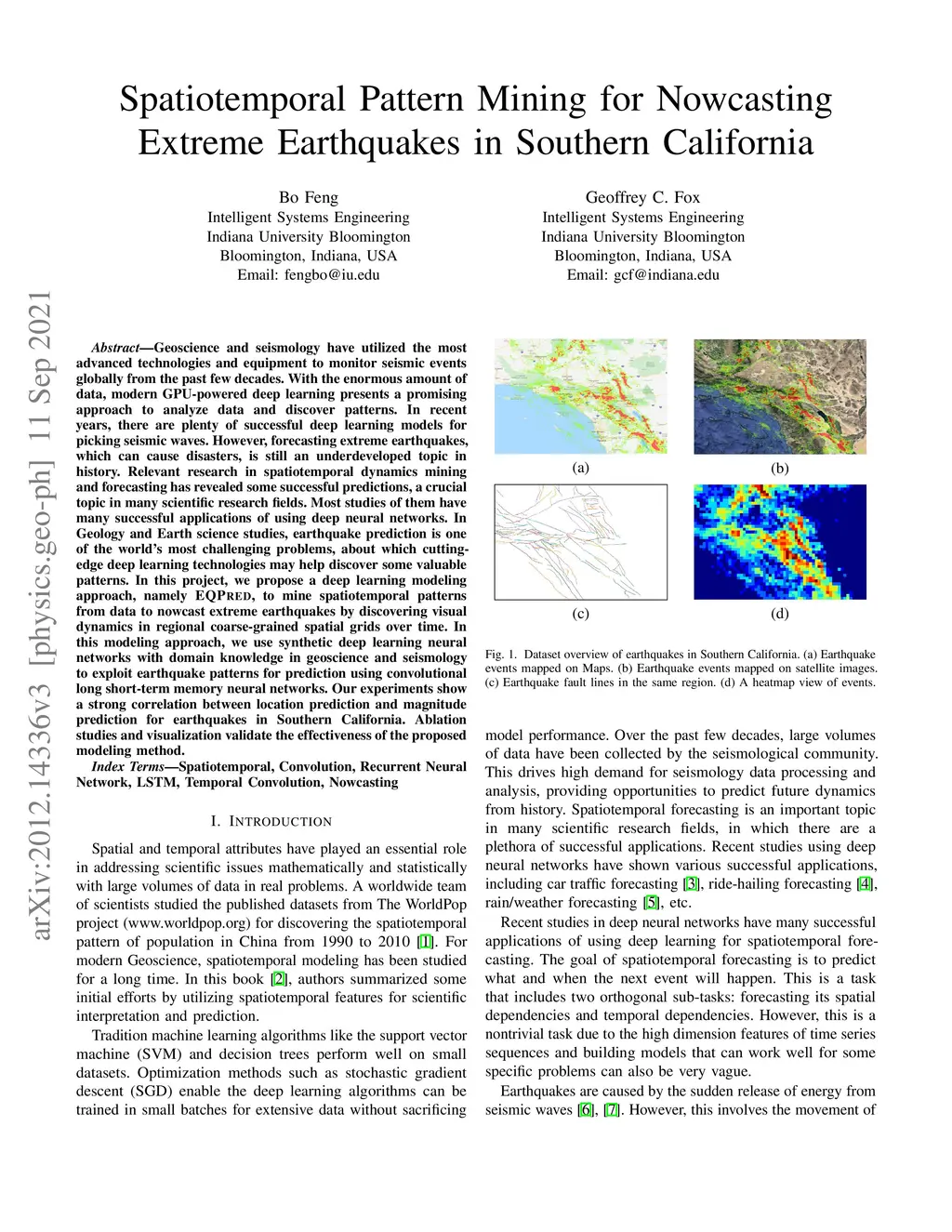 Geoscience and seismology have utilized the most advanced technologies and equipment to monitor seismic events globally from the past few decades. With the enormous amount of data, modern GPU-powered deep learning presents a promising approach to analyze data and discover patterns. In recent years, there are plenty of successful deep learning models for picking seismic waves. However, forecasting extreme earthquakes, which can cause disasters, is still an underdeveloped topic in history. Relevant research in spatiotemporal dynamics mining and forecasting has revealed some successful predictions, a crucial topic in many scientific research fields. Most studies of them have many successful applications of using deep neural networks. In Geology and Earth science studies, earthquake prediction is one of the world's most challenging problems, about which cutting-edge deep learning technologies may help discover some valuable patterns. In this project, we propose a deep learning modeling approach, namely \tseqpre, to mine spatiotemporal patterns from data to nowcast extreme earthquakes by discovering visual dynamics in regional coarse-grained spatial grids over time. In this modeling approach, we use synthetic deep learning neural networks with domain knowledge in geoscience and seismology to exploit earthquake patterns for prediction using convolutional long short-term memory neural networks. Our experiments show a strong correlation between location prediction and magnitude prediction for earthquakes in Southern California. Ablation studies and visualization validate the effectiveness of the proposed modeling method.