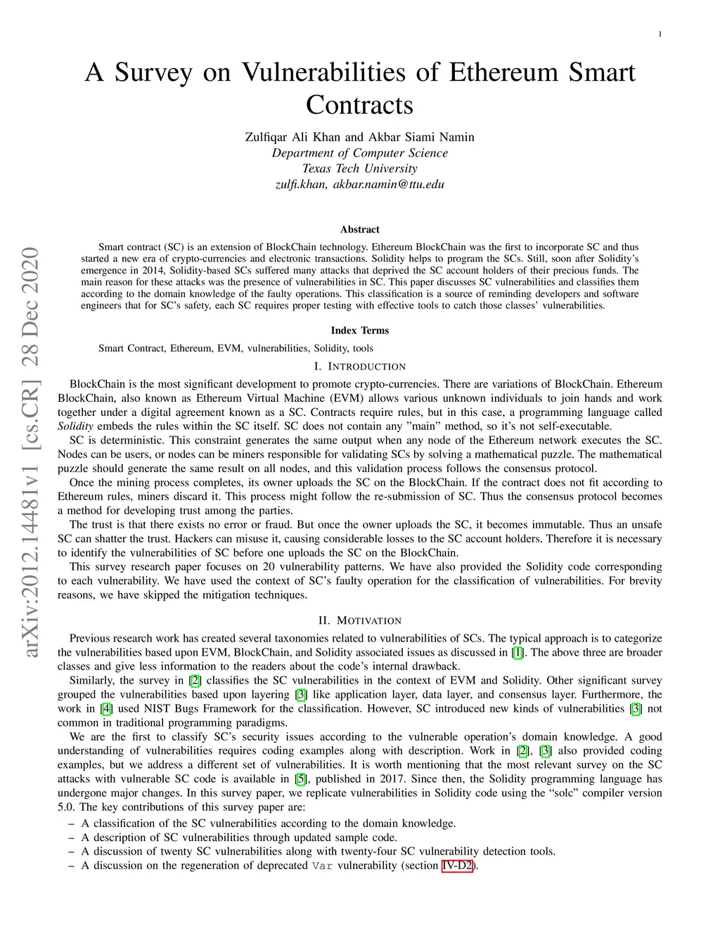 A Survey on Vulnerabilities of Ethereum Smart Contracts