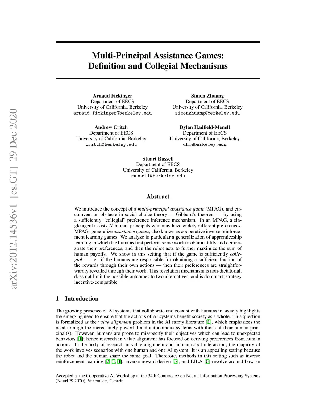 We introduce the concept of a multi-principal assistance game (MPAG), and circumvent an obstacle in social choice theory, Gibbard's theorem, by using a sufficiently collegial preference inference mechanism. In an MPAG, a single agent assists N human principals who may have widely different preferences. MPAGs generalize assistance games, also known as cooperative inverse reinforcement learning games. We analyze in particular a generalization of apprenticeship learning in which the humans first perform some work to obtain utility and demonstrate their preferences, and then the robot acts to further maximize the sum of human payoffs. We show in this setting that if the game is sufficiently collegial, i.e. if the humans are responsible for obtaining a sufficient fraction of the rewards through their own actions, then their preferences are straightforwardly revealed through their work. This revelation mechanism is non-dictatorial, does not limit the possible outcomes to two alternatives, and is dominant-strategy incentive-compatible.