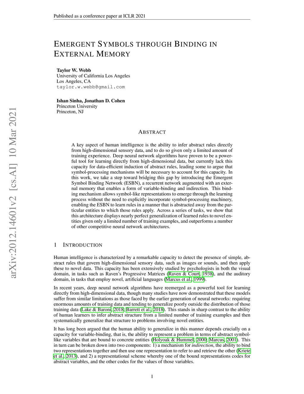 A key aspect of human intelligence is the ability to infer abstract rules directly from high-dimensional sensory data, and to do so given only a limited amount of training experience. Deep neural network algorithms have proven to be a powerful tool for learning directly from high-dimensional data, but currently lack this capacity for data-efficient induction of abstract rules, leading some to argue that symbol-processing mechanisms will be necessary to account for this capacity. In this work, we take a step toward bridging this gap by introducing the Emergent Symbol Binding Network (ESBN), a recurrent network augmented with an external memory that enables a form of variable-binding and indirection. This binding mechanism allows symbol-like representations to emerge through the learning process without the need to explicitly incorporate symbol-processing machinery, enabling the ESBN to learn rules in a manner that is abstracted away from the particular entities to which those rules apply. Across a series of tasks, we show that this architecture displays nearly perfect generalization of learned rules to novel entities given only a limited number of training examples, and outperforms a number of other competitive neural network architectures.