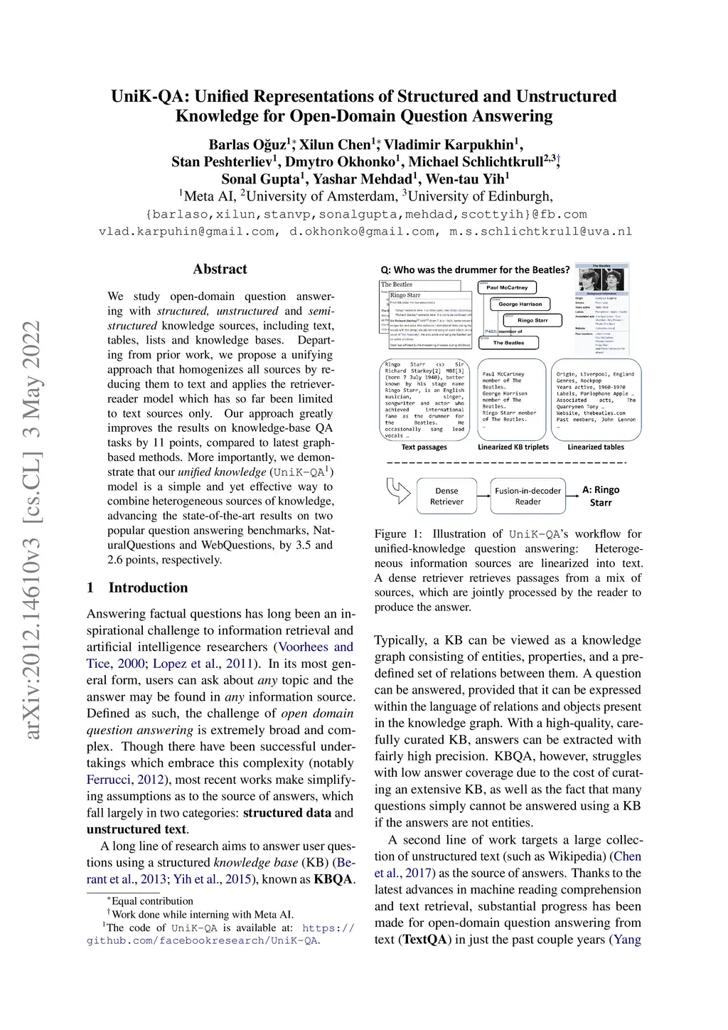 UniK-QA: Unified Representations of Structured and Unstructured