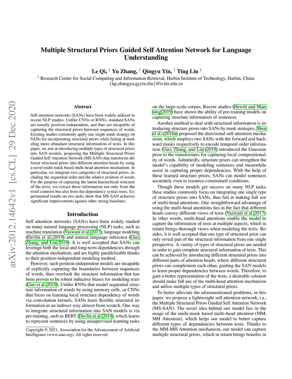 Self attention networks (SANs) have been widely utilized in recent NLP studies. Unlike CNNs or RNNs, standard SANs are usually position-independent, and thus are incapable of capturing the structural priors between sequences of words. Existing studies commonly apply one single mask strategy on SANs for incorporating structural priors while failing at modeling more abundant structural information of texts. In this paper, we aim at introducing multiple types of structural priors into SAN models, proposing the Multiple Structural Priors Guided Self Attention Network (MS-SAN) that transforms different structural priors into different attention heads by using a novel multi-mask based multi-head attention mechanism. In particular, we integrate two categories of structural priors, including the sequential order and the relative position of words. For the purpose of capturing the latent hierarchical structure of the texts, we extract these information not only from the word contexts but also from the dependency syntax trees. Experimental results on two tasks show that MS-SAN achieves significant improvements against other strong baselines.