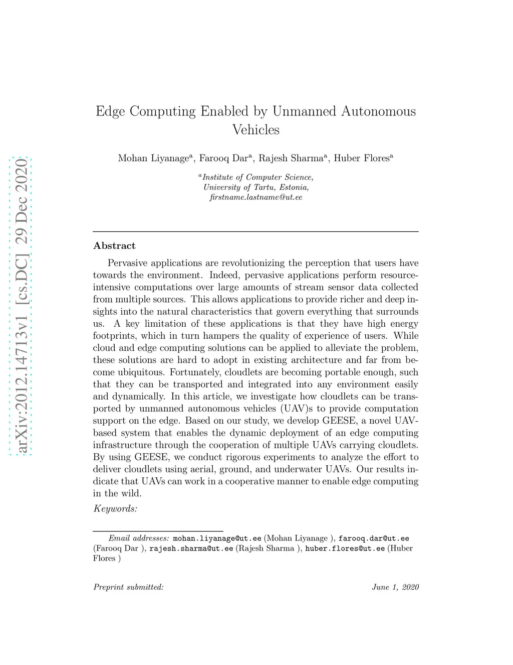 Pervasive applications are revolutionizing the perception that users have towards the environment. Indeed, pervasive applications perform resource intensive computations over large amounts of stream sensor data collected from multiple sources. This allows applications to provide richer and deep insights into the natural characteristics that govern everything that surrounds us. A key limitation of these applications is that they have high energy footprints, which in turn hampers the quality of experience of users. While cloud and edge computing solutions can be applied to alleviate the problem, these solutions are hard to adopt in existing architecture and far from become ubiquitous. Fortunately, cloudlets are becoming portable enough, such that they can be transported and integrated into any environment easily and dynamically. In this article, we investigate how cloudlets can be transported by unmanned autonomous vehicles (UAV)s to provide computation support on the edge. Based on our study, we develop GEESE, a novel UAVbased system that enables the dynamic deployment of an edge computing infrastructure through the cooperation of multiple UAVs carrying cloudlets. By using GEESE, we conduct rigorous experiments to analyze the effort to deliver cloudlets using aerial, ground, and underwater UAVs. Our results indicate that UAVs can work in a cooperative manner to enable edge computing in the wild.