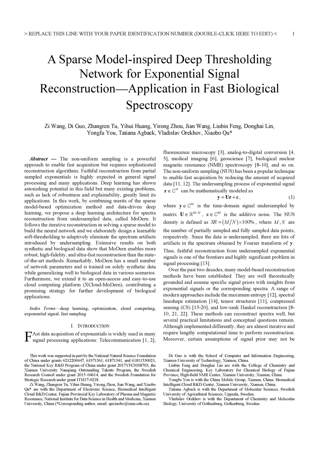 The non-uniform sampling is a powerful approach to enable fast acquisition but requires sophisticated reconstruction algorithms. Faithful reconstruction from partial sampled exponentials is highly expected in general signal processing and many applications. Deep learning has shown astonishing potential in this field but many existing problems, such as lack of robustness and explainability, greatly limit its applications. In this work, by combining merits of the sparse model-based optimization method and data-driven deep learning, we propose a deep learning architecture for spectra reconstruction from undersampled data, called MoDern. It follows the iterative reconstruction in solving a sparse model to build the neural network and we elaborately design a learnable soft-thresholding to adaptively eliminate the spectrum artifacts introduced by undersampling. Extensive results on both synthetic and biological data show that MoDern enables more robust, high-fidelity, and ultra-fast reconstruction than the state-of-the-art methods. Remarkably, MoDern has a small number of network parameters and is trained on solely synthetic data while generalizing well to biological data in various scenarios. Furthermore, we extend it to an open-access and easy-to-use cloud computing platform (XCloud-MoDern), contributing a promising strategy for further development of biological applications.
