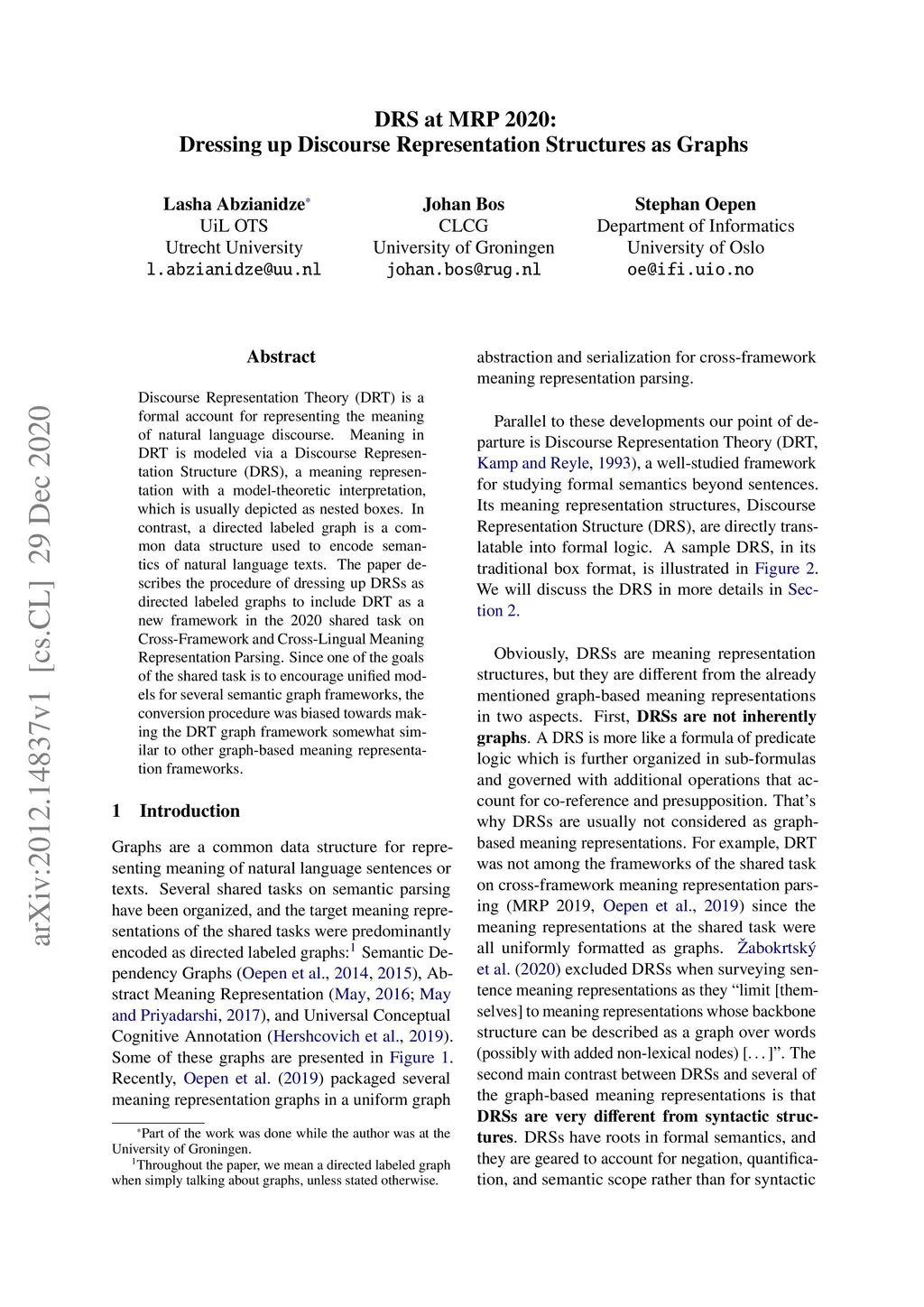 Discourse Representation Theory (DRT) is a formal account for representing the meaning of natural language discourse. Meaning in DRT is modeled via a Discourse Representation Structure (DRS), a meaning representation with a model-theoretic interpretation, which is usually depicted as nested boxes. In contrast, a directed labeled graph is a common data structure used to encode semantics of natural language texts. The paper describes the procedure of dressing up DRSs as directed labeled graphs to include DRT as a new framework in the 2020 shared task on Cross-Framework and Cross-Lingual Meaning Representation Parsing. Since one of the goals of the shared task is to encourage unified models for several semantic graph frameworks, the conversion procedure was biased towards making the DRT graph framework somewhat similar to other graph-based meaning representation frameworks.