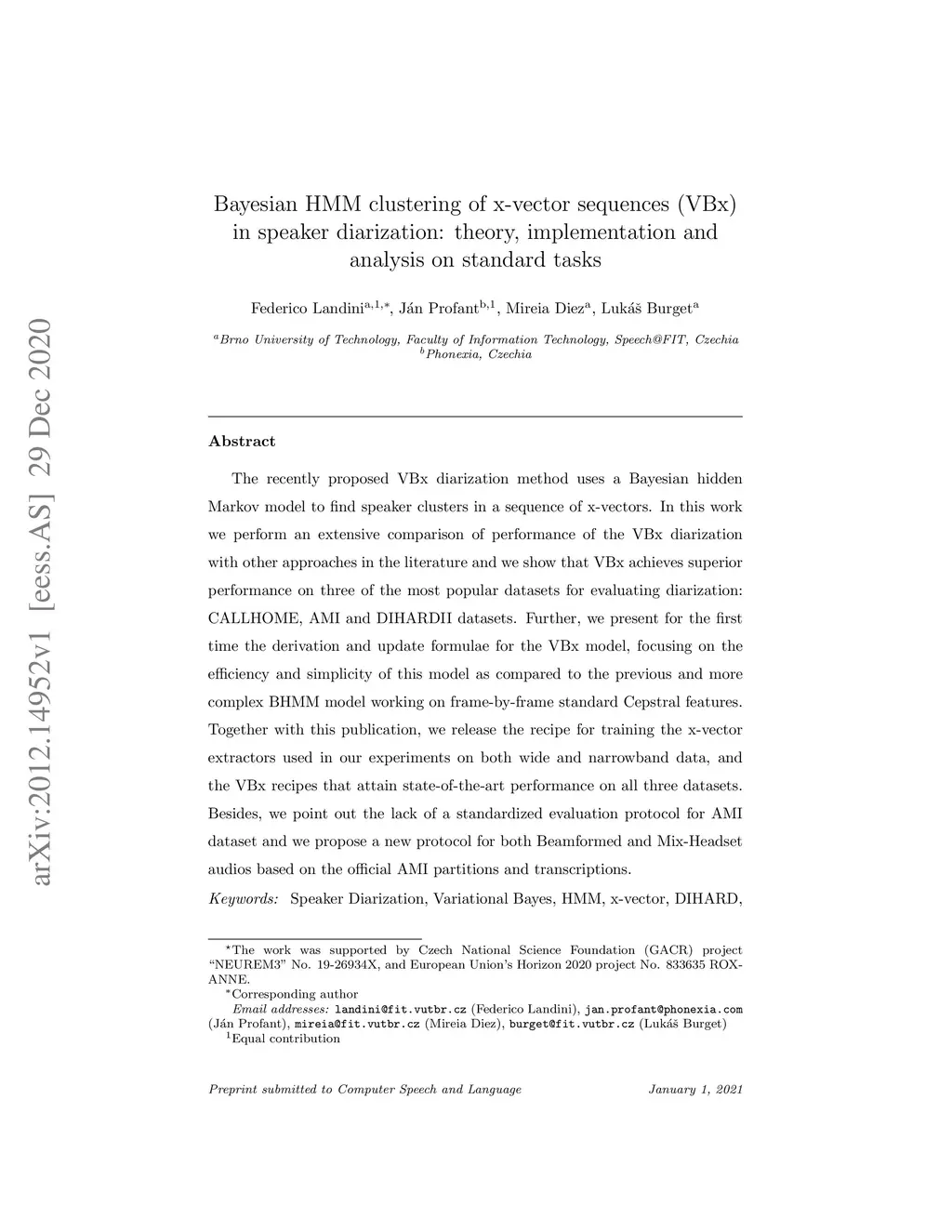 Bayesian HMM clustering of x-vector sequences (VBx) in speaker