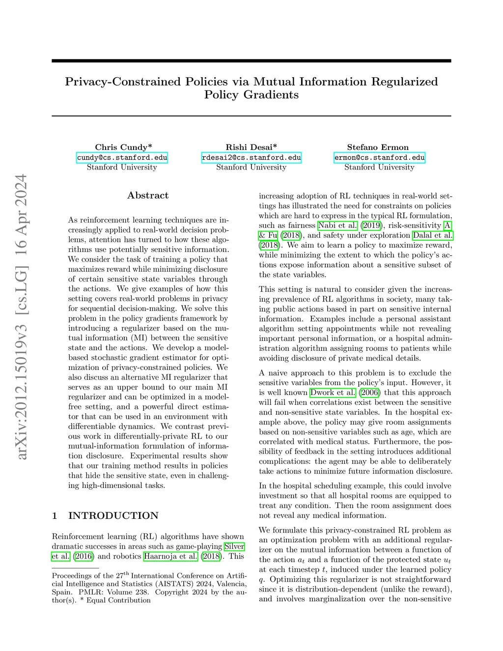 As reinforcement learning techniques are increasingly applied to real-world decision problems, attention has turned to how these algorithms use potentially sensitive information. We consider the task of training a policy that maximizes reward while minimizing disclosure of certain sensitive state variables through the actions. We give examples of how this setting covers real-world problems in privacy for sequential decision-making. We solve this problem in the policy gradients framework by introducing a regularizer based on the mutual information (MI) between the sensitive state and the actions. We develop a model-based stochastic gradient estimator for optimization of privacy-constrained policies. We also discuss an alternative MI regularizer that serves as an upper bound to our main MI regularizer and can be optimized in a model-free setting, and a powerful direct estimator that can be used in an environment with differentiable dynamics. We contrast previous work in differentially-private RL to our mutual-information formulation of information disclosure. Experimental results show that our training method results in policies that hide the sensitive state, even in challenging high-dimensional tasks.