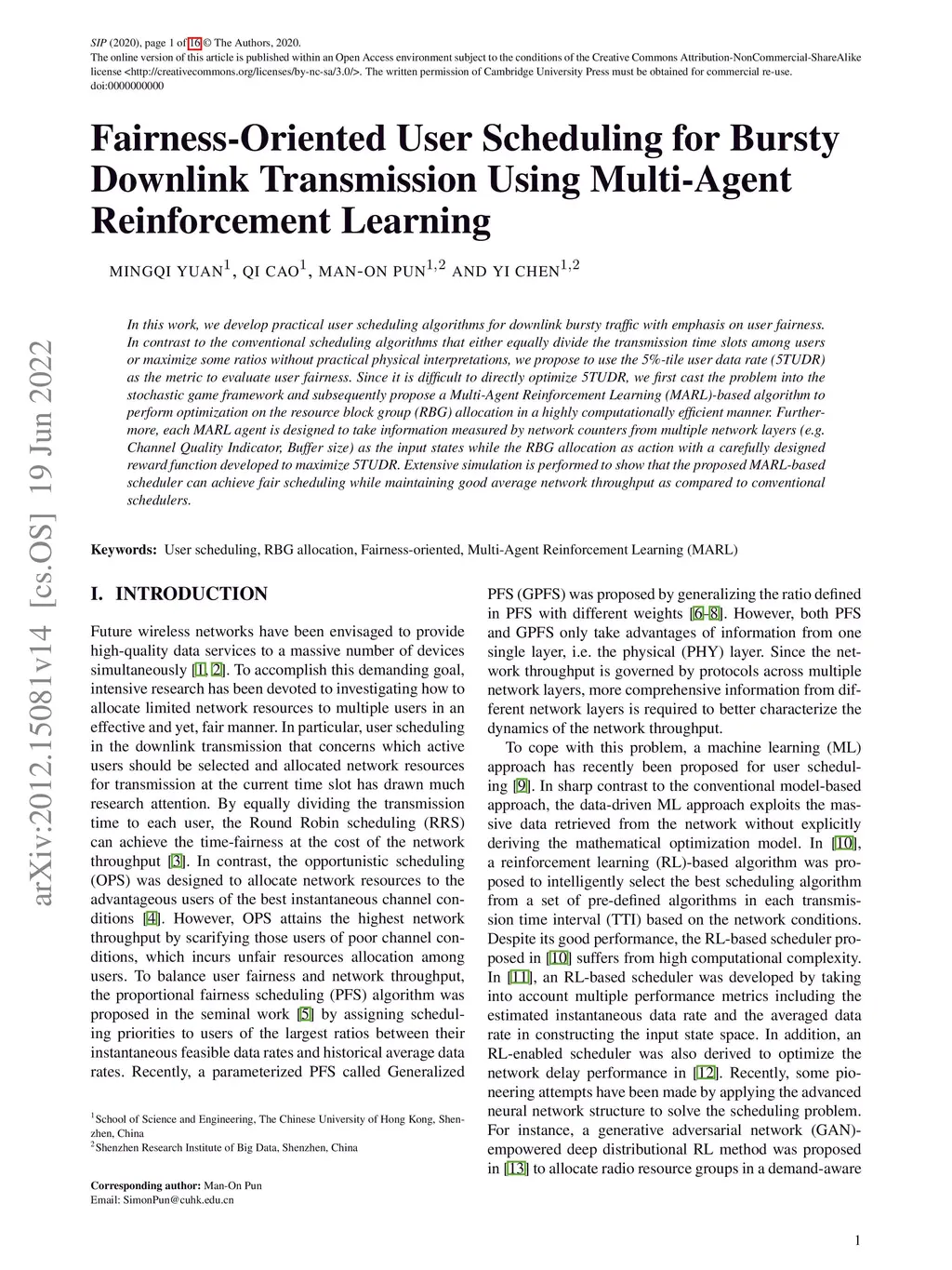In this work, we develop practical user scheduling algorithms for downlink bursty traffic with emphasis on user fairness. In contrast to the conventional scheduling algorithms that either equally divides the transmission time slots among users or maximizing some ratios without physcial meanings, we propose to use the 5%-tile user data rate (5TUDR) as the metric to evaluate user fairness. Since it is difficult to directly optimize 5TUDR, we first cast the problem into the stochastic game framework and subsequently propose a Multi-Agent Reinforcement Learning (MARL)-based algorithm to perform distributed optimization on the resource block group (RBG) allocation. Furthermore, each MARL agent is designed to take information measured by network counters from multiple network layers (e.g. Channel Quality Indicator, Buffer size) as the input states while the RBG allocation as action with a proposed reward function designed to maximize 5TUDR. Extensive simulation is performed to show that the proposed MARL-based scheduler can achieve fair scheduling while maintaining good average network throughput as compared to conventional schedulers.