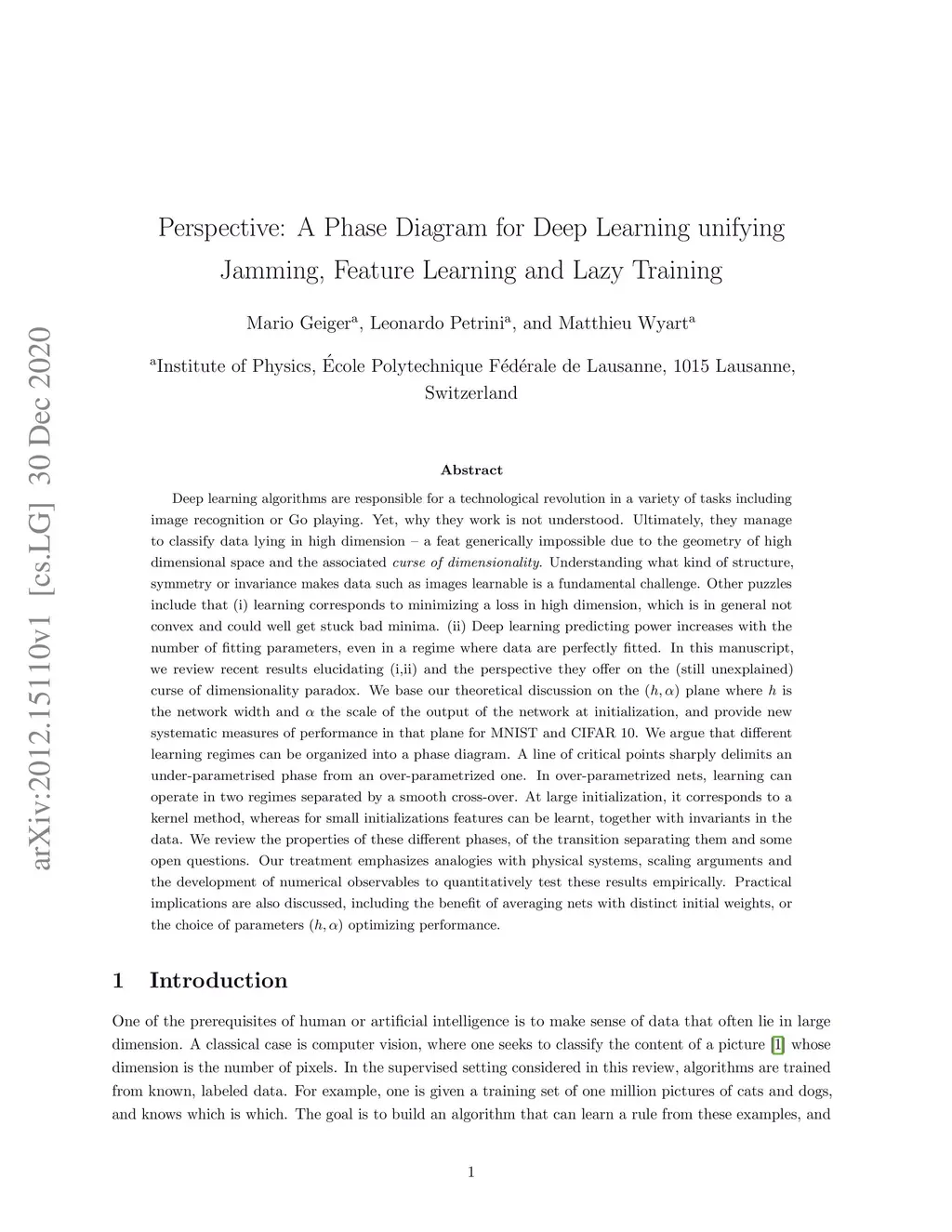 Deep learning algorithms are responsible for a technological revolution in a variety of tasks including image recognition or Go playing. Yet, why they work is not understood. Ultimately, they manage to classify data lying in high dimension -- a feat generically impossible due to the geometry of high dimensional space and the associated curse of dimensionality. Understanding what kind of structure, symmetry or invariance makes data such as images learnable is a fundamental challenge. Other puzzles include that (i) learning corresponds to minimizing a loss in high dimension, which is in general not convex and could well get stuck bad minima. (ii) Deep learning predicting power increases with the number of fitting parameters, even in a regime where data are perfectly fitted. In this manuscript, we review recent results elucidating (i,ii) and the perspective they offer on the (still unexplained) curse of dimensionality paradox. We base our theoretical discussion on the plane where is the network width and the scale of the output of the network at initialization, and provide new systematic measures of performance in that plane for MNIST and CIFAR 10. We argue that different learning regimes can be organized into a phase diagram. A line of critical points sharply delimits an under-parametrised phase from an over-parametrized one. In over-parametrized nets, learning can operate in two regimes separated by a smooth cross-over. At large initialization, it corresponds to a kernel method, whereas for small initializations features can be learnt, together with invariants in the data. We review the properties of these different phases, of the transition separating them and some open questions. Our treatment emphasizes analogies with physical systems, scaling arguments and the development of numerical observables to quantitatively test these results empirically.