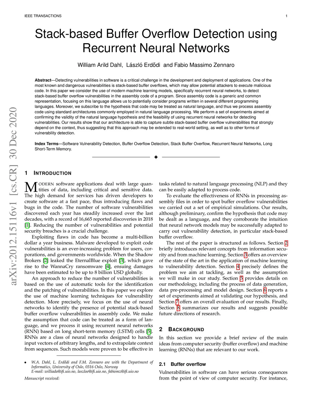 Stack-based Buffer Overflow Detection using Recurrent Neural Networks