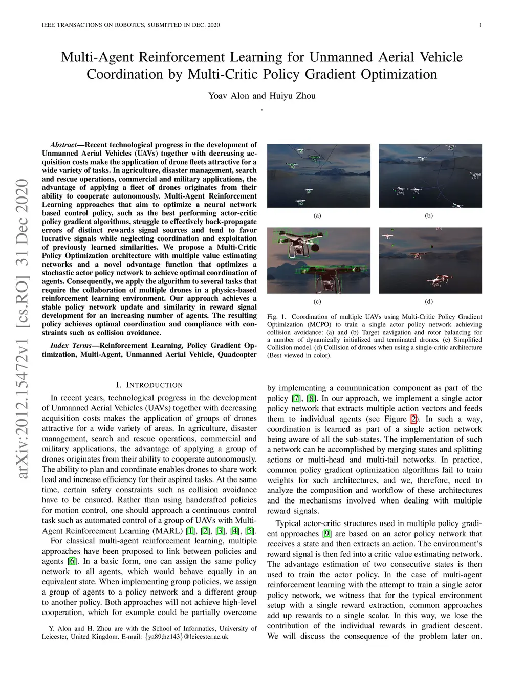 Recent technological progress in the development of Unmanned Aerial Vehicles (UAVs) together with decreasing acquisition costs make the application of drone fleets attractive for a wide variety of tasks. In agriculture, disaster management, search and rescue operations, commercial and military applications, the advantage of applying a fleet of drones originates from their ability to cooperate autonomously. Multi-Agent Reinforcement Learning approaches that aim to optimize a neural network based control policy, such as the best performing actor-critic policy gradient algorithms, struggle to effectively back-propagate errors of distinct rewards signal sources and tend to favor lucrative signals while neglecting coordination and exploitation of previously learned similarities. We propose a Multi-Critic Policy Optimization architecture with multiple value estimating networks and a novel advantage function that optimizes a stochastic actor policy network to achieve optimal coordination of agents. Consequently, we apply the algorithm to several tasks that require the collaboration of multiple drones in a physics-based reinforcement learning environment. Our approach achieves a stable policy network update and similarity in reward signal development for an increasing number of agents. The resulting policy achieves optimal coordination and compliance with constraints such as collision avoidance.