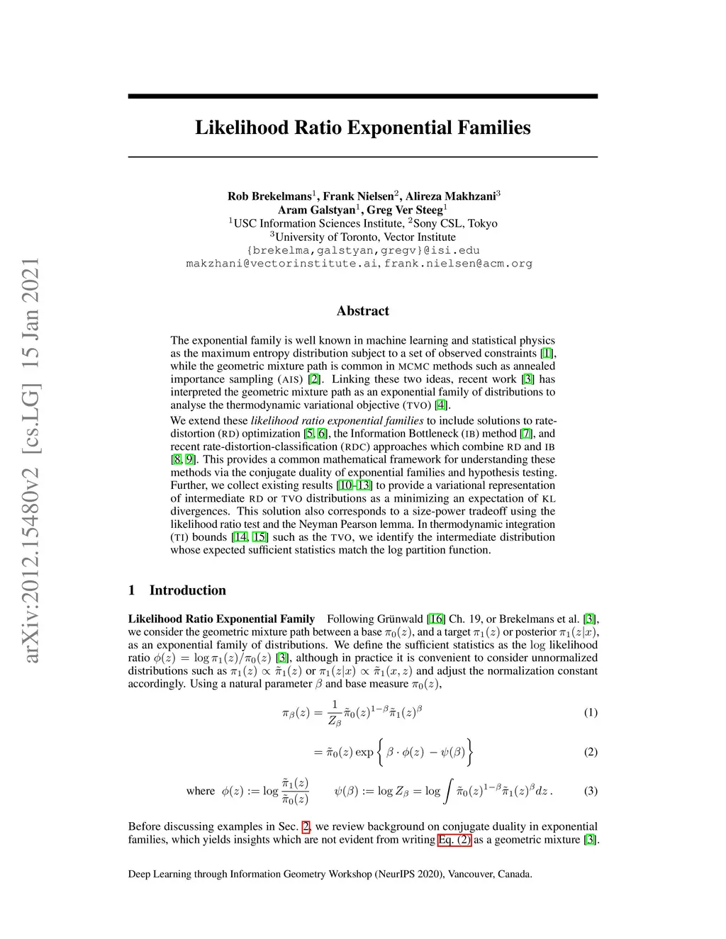 The exponential family is well known in machine learning and statistical physics as the maximum entropy distribution subject to a set of observed constraints, while the geometric mixture path is common in MCMC methods such as annealed importance sampling. Linking these two ideas, recent work has interpreted the geometric mixture path as an exponential family of distributions to analyze the thermodynamic variational objective (TVO). We extend these likelihood ratio exponential families to include solutions to rate-distortion (RD) optimization, the information bottleneck (IB) method, and recent rate-distortion-classification approaches which combine RD and IB. This provides a common mathematical framework for understanding these methods via the conjugate duality of exponential families and hypothesis testing. Further, we collect existing results to provide a variational representation of intermediate RD or TVO distributions as a minimizing an expectation of KL divergences. This solution also corresponds to a size-power tradeoff using the likelihood ratio test and the Neyman Pearson lemma. In thermodynamic integration bounds such as the TVO, we identify the intermediate distribution whose expected sufficient statistics match the log partition function.