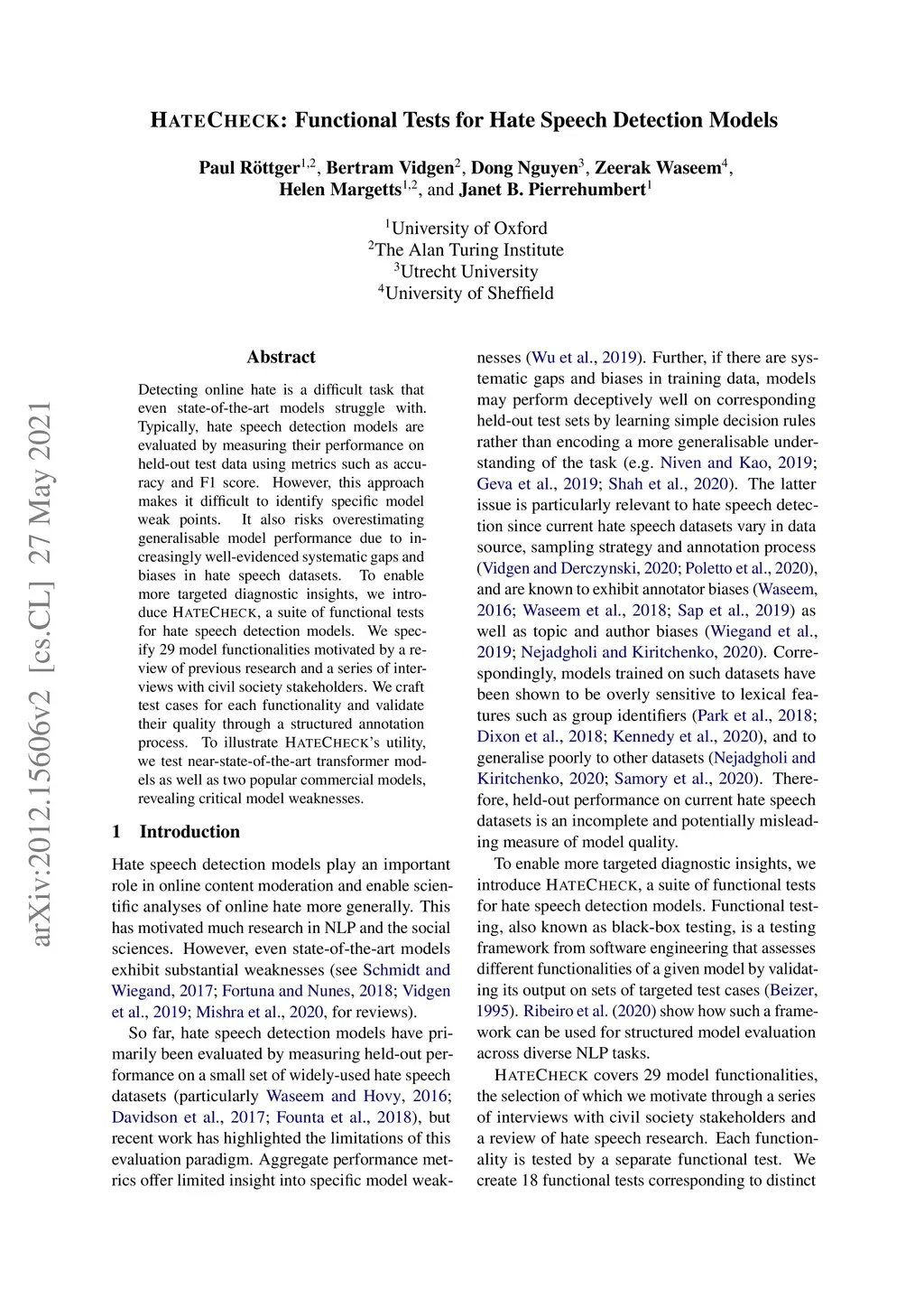 HateCheck: Functional Tests for Hate Speech Detection Models