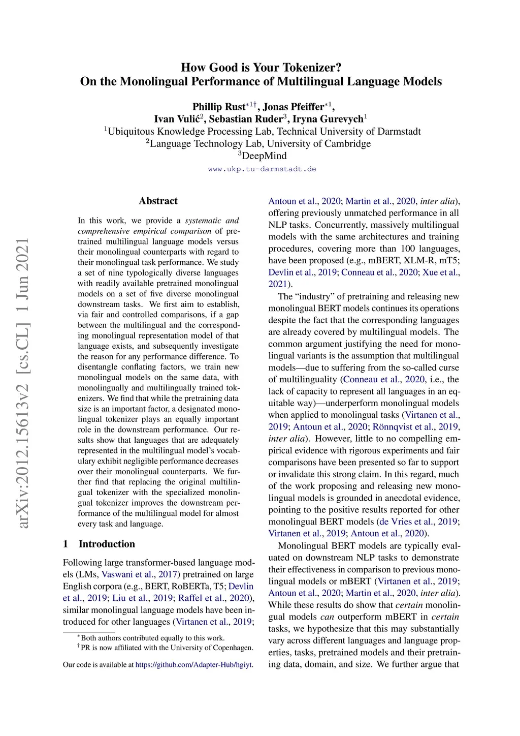 In this work, we provide a systematic and comprehensive empirical comparison of pretrained multilingual language models versus their monolingual counterparts with regard to their monolingual task performance. We study a set of nine typologically diverse languages with readily available pretrained monolingual models on a set of five diverse monolingual downstream tasks. We first aim to establish, via fair and controlled comparisons, if a gap between the multilingual and the corresponding monolingual representation of that language exists, and subsequently investigate the reason for any performance difference. To disentangle conflating factors, we train new monolingual models on the same data, with monolingually and multilingually trained tokenizers. We find that while the pretraining data size is an important factor, a designated monolingual tokenizer plays an equally important role in the downstream performance. Our results show that languages that are adequately represented in the multilingual model's vocabulary exhibit negligible performance decreases over their monolingual counterparts. We further find that replacing the original multilingual tokenizer with the specialized monolingual tokenizer improves the downstream performance of the multilingual model for almost every task and language.