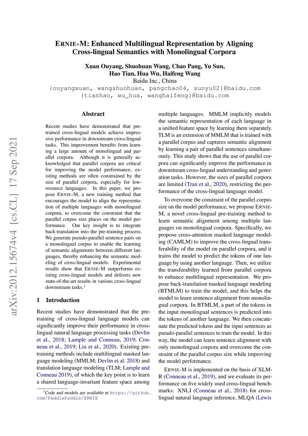 ERNIE-M: Enhanced Multilingual Representation by Aligning Cross-lingual