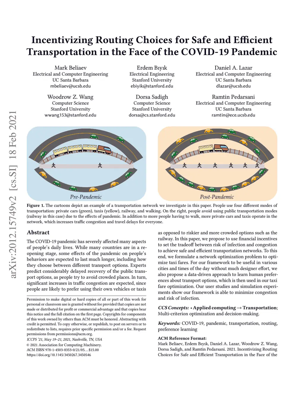 The COVID-19 pandemic has severely affected many aspects of people's daily lives. While many countries are in a re-opening stage, some effects of the pandemic on people's behaviors are expected to last much longer, including how they choose between different transport options. Experts predict considerably delayed recovery of the public transport options, as people try to avoid crowded places. In turn, significant increases in traffic congestion are expected, since people are likely to prefer using their own vehicles or taxis as opposed to riskier and more crowded options such as the railway. In this paper, we propose to use financial incentives to set the tradeoff between risk of infection and congestion to achieve safe and efficient transportation networks. To this end, we formulate a network optimization problem to optimize taxi fares. For our framework to be useful in various cities and times of the day without much designer effort, we also propose a data-driven approach to learn human preferences about transport options, which is then used in our taxi fare optimization. Our user studies and simulation experiments show our framework is able to minimize congestion and risk of infection.